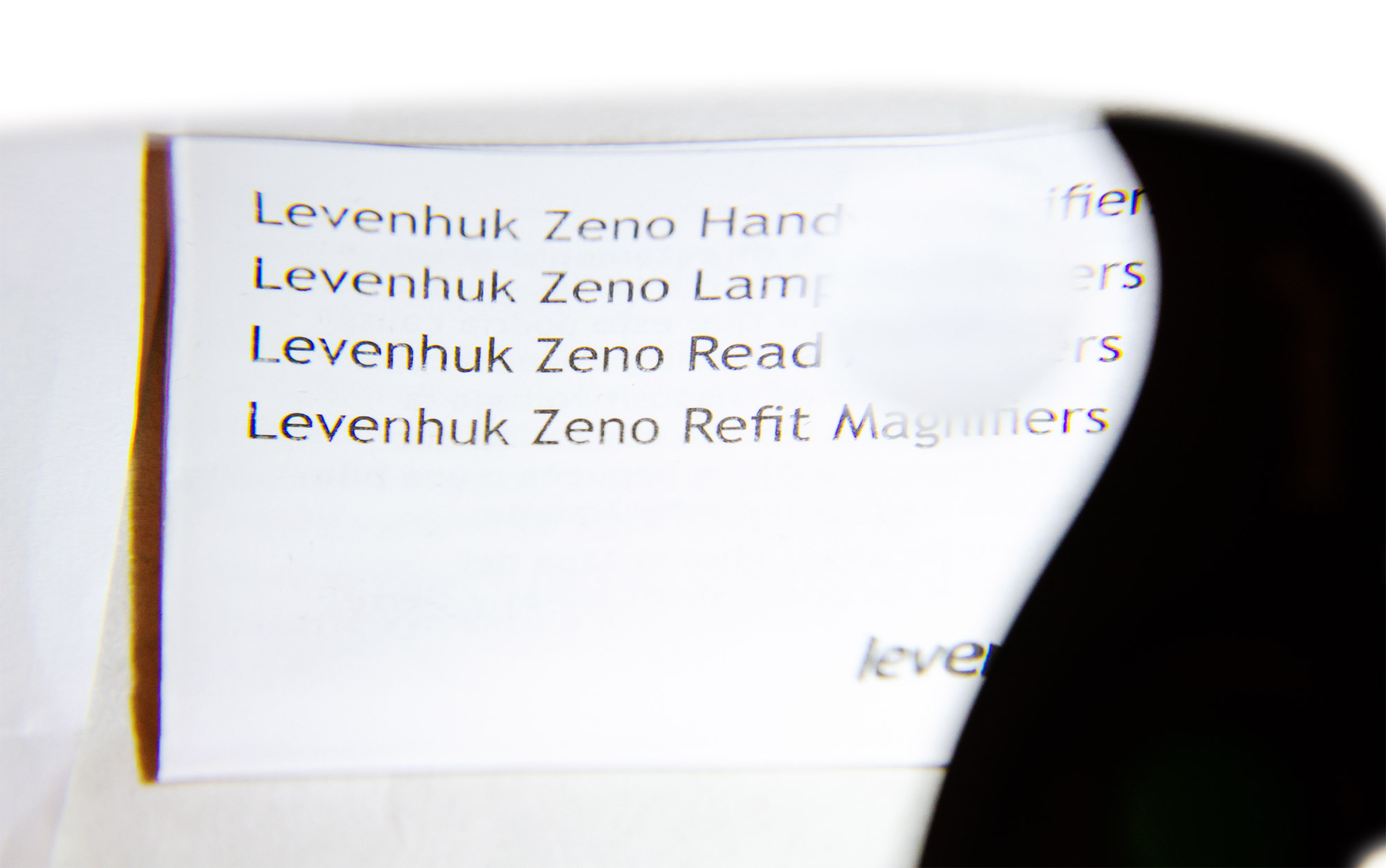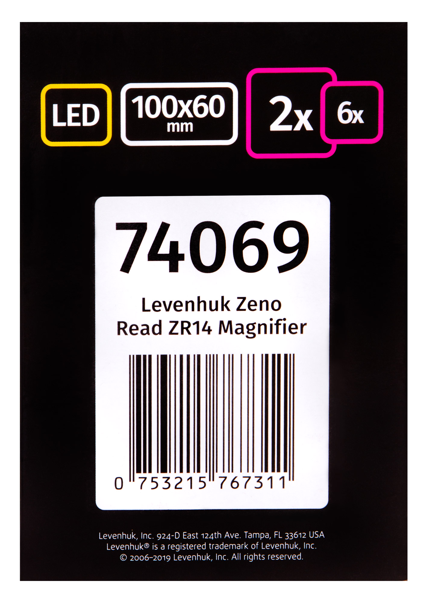 Пластиковая бифокальная линза лупы Levenhuk Zeno Read ZR14 дает два увеличения – двукратное (по большому периметру) и шестикратное (по малому). Рядом с линзой расположена подсветка из ярких светодиодов. Она создает равномерное освещение, достаточное для использования лупы даже в темном помещении. Подсветка работает от батареек (приобретаются отдельно). Лупа поставляется в комплекте с защитным чехлом.