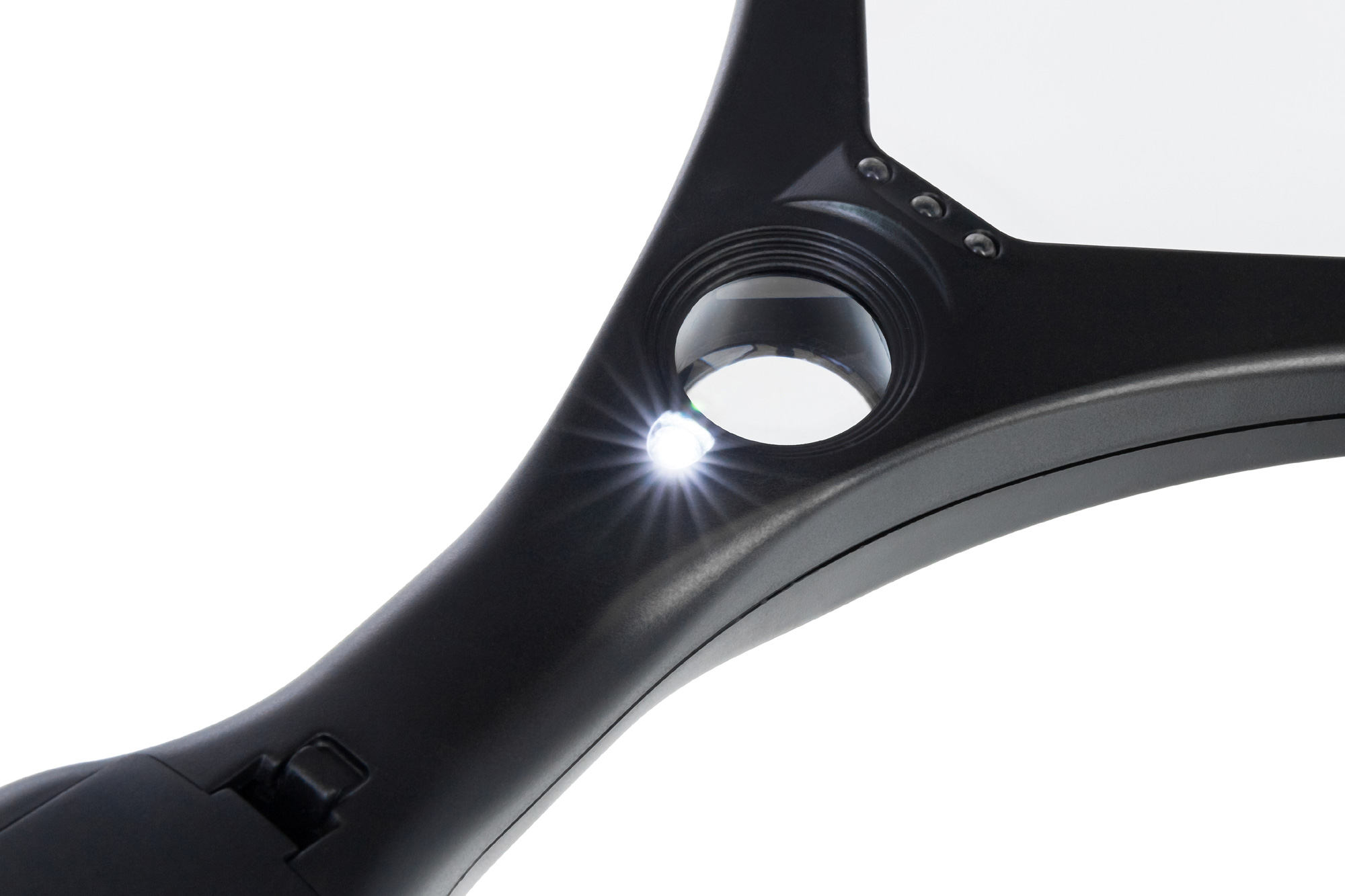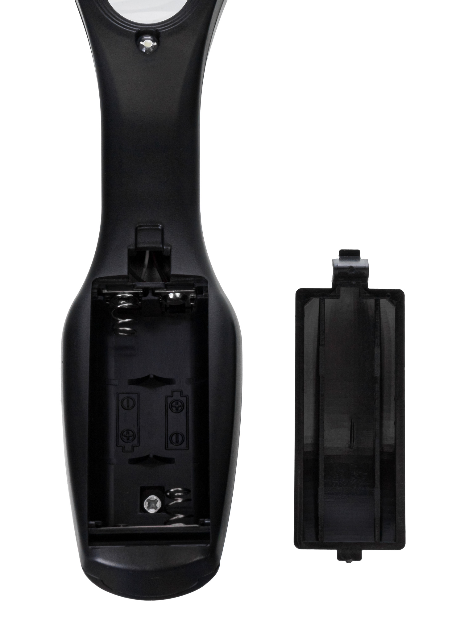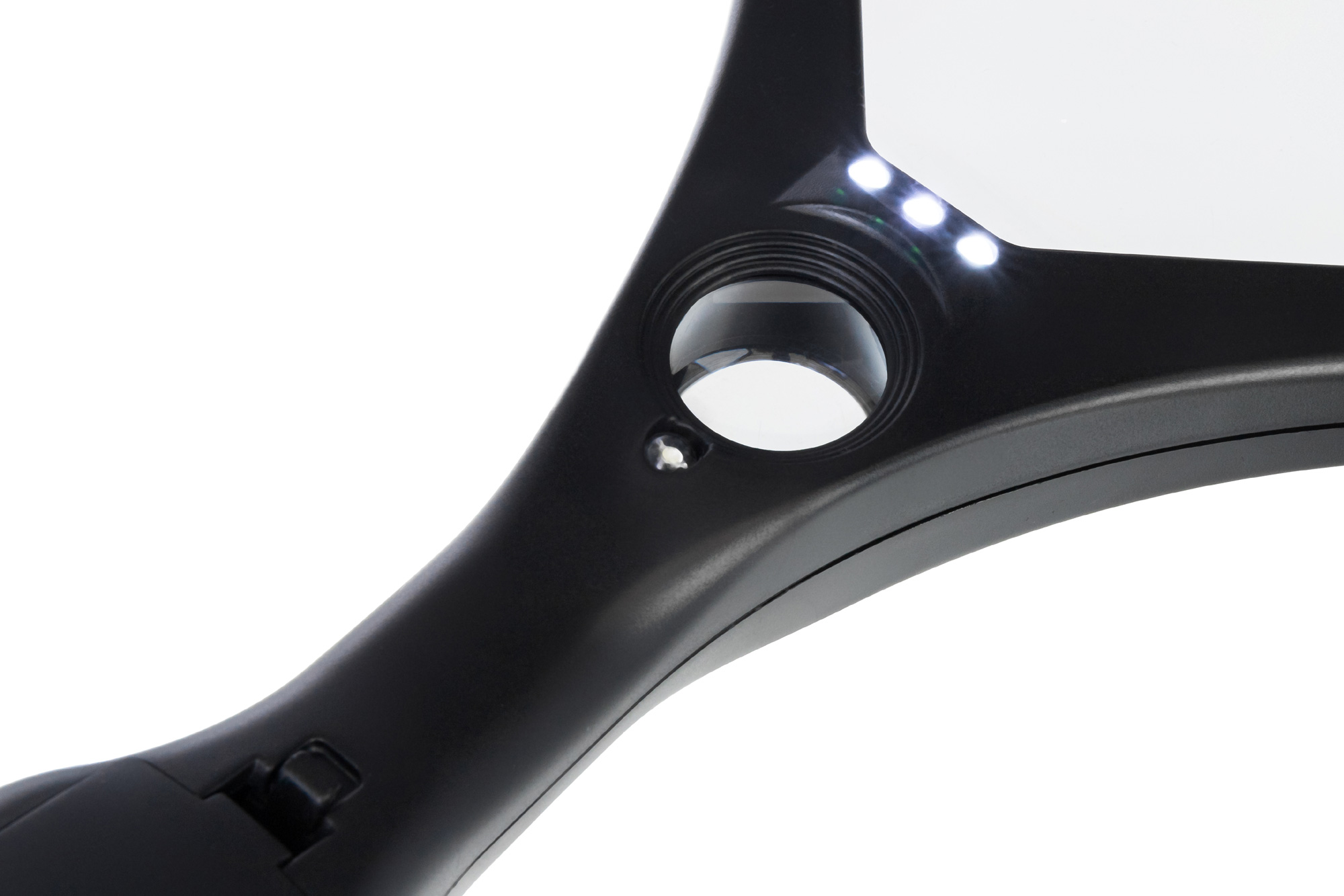 Основная линза дает увеличение в 2,5 крата, дополнительная (находится в ручке) – 20 крат. Рядом с линзами расположены небольшие светодиоды. Они создают яркое освещение, достаточное для использования лупы даже в полной темноте. Подсветка работает от батареек (нет в комплекте).