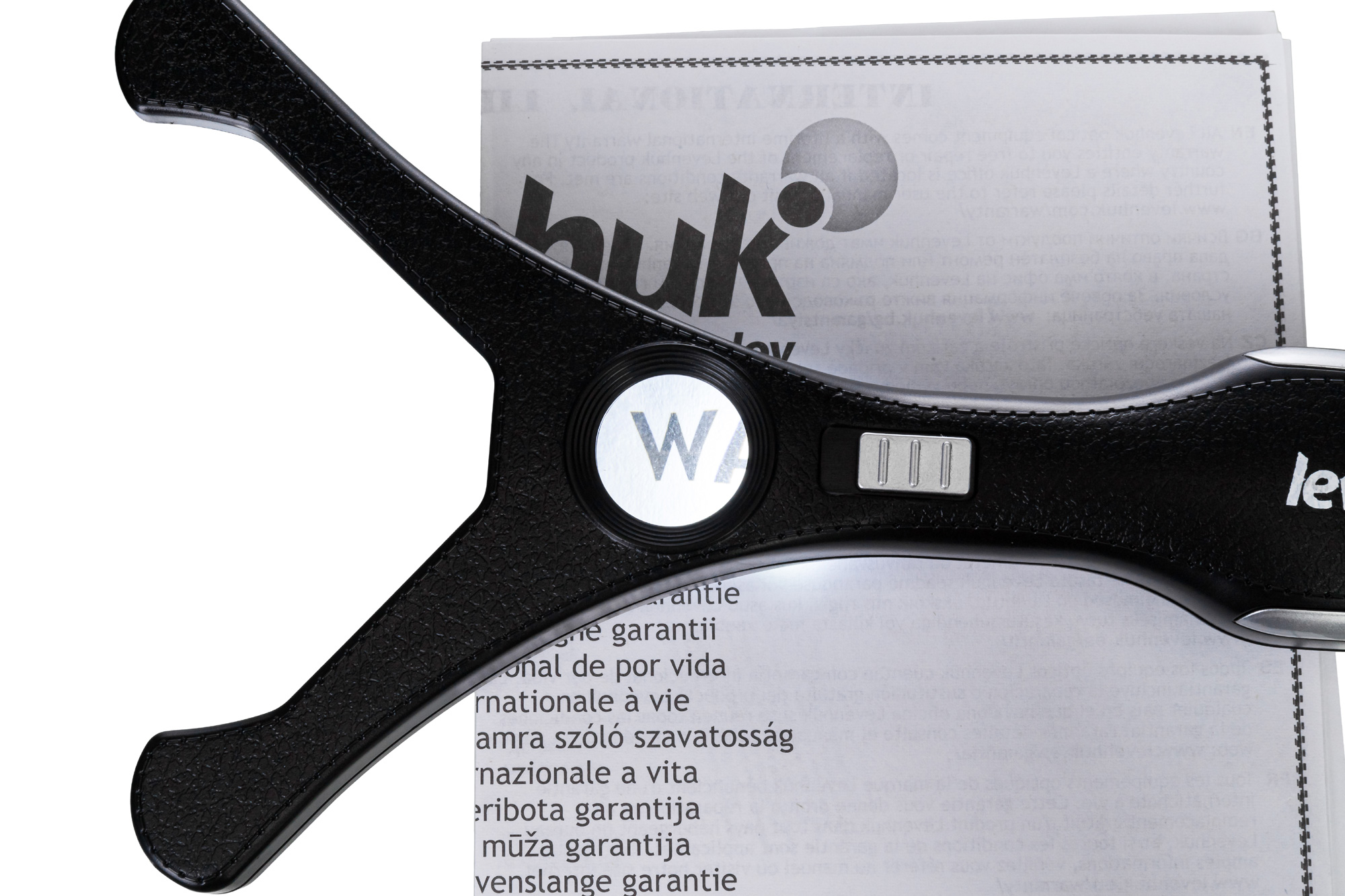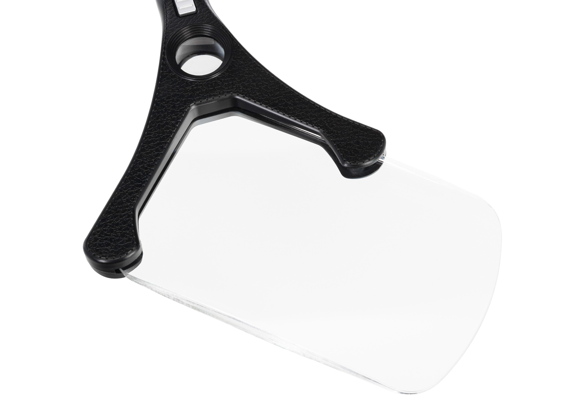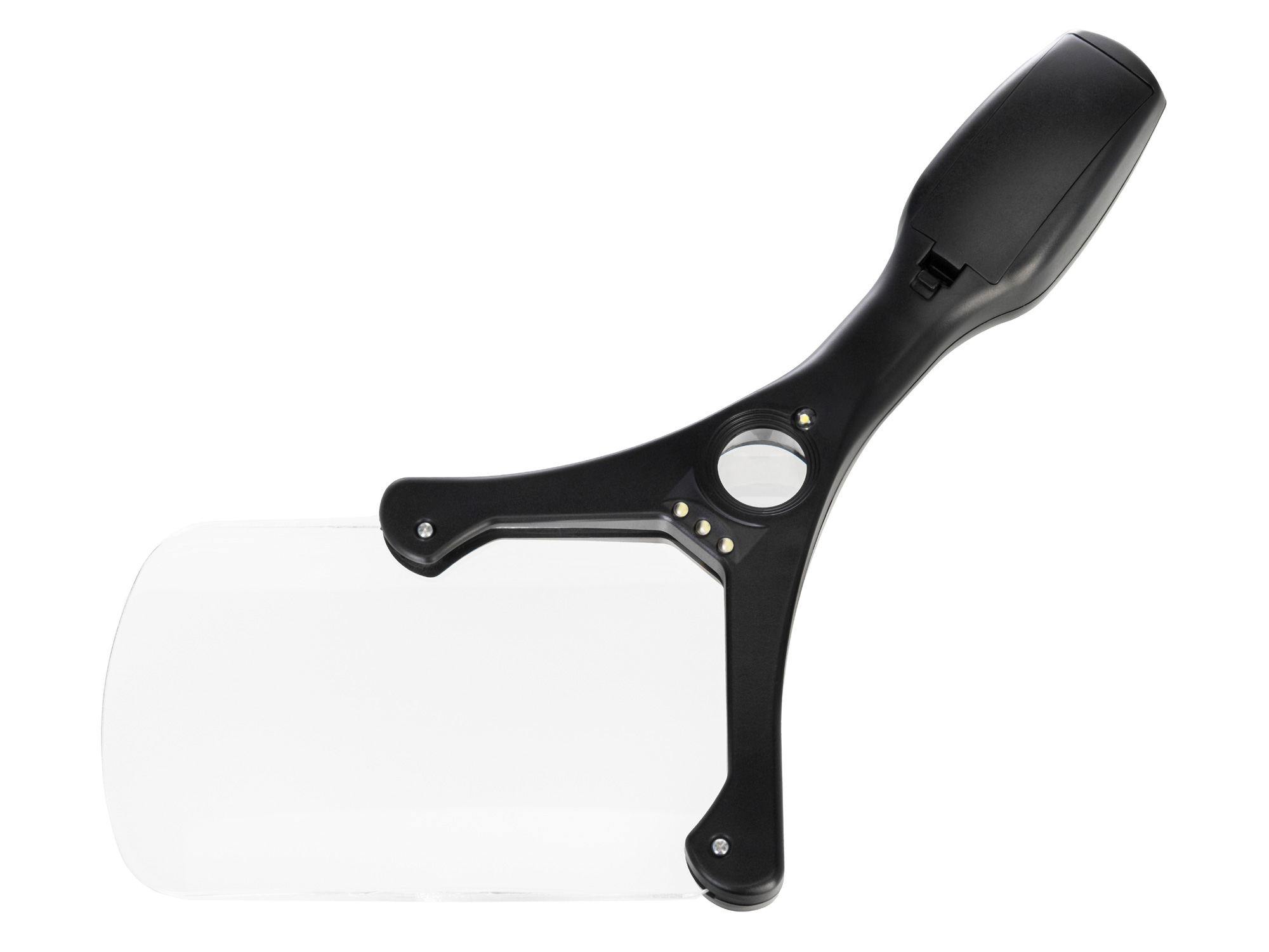 Основная линза дает увеличение в 2,5 крата, дополнительная (находится в ручке) – 20 крат. Рядом с линзами расположены небольшие светодиоды. Они создают яркое освещение, достаточное для использования лупы даже в полной темноте. Подсветка работает от батареек (нет в комплекте).