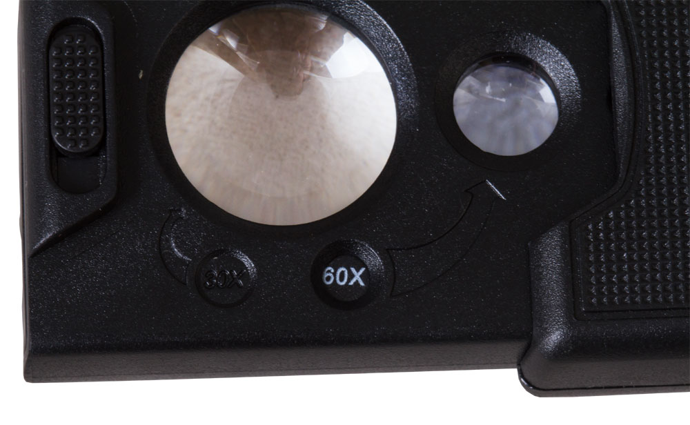 Прибор снабжен сразу двумя типами подсветки в торцах корпуса. Светодиод формирует яркое освещение. Ультрафиолетовая лампочка позволяет рассматривать объекты в невидимом невооруженному глазу спектре, например, документы или денежные купюры с водяными знаками.