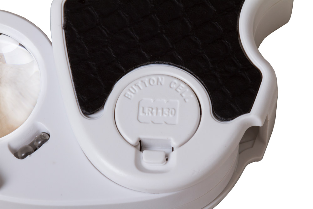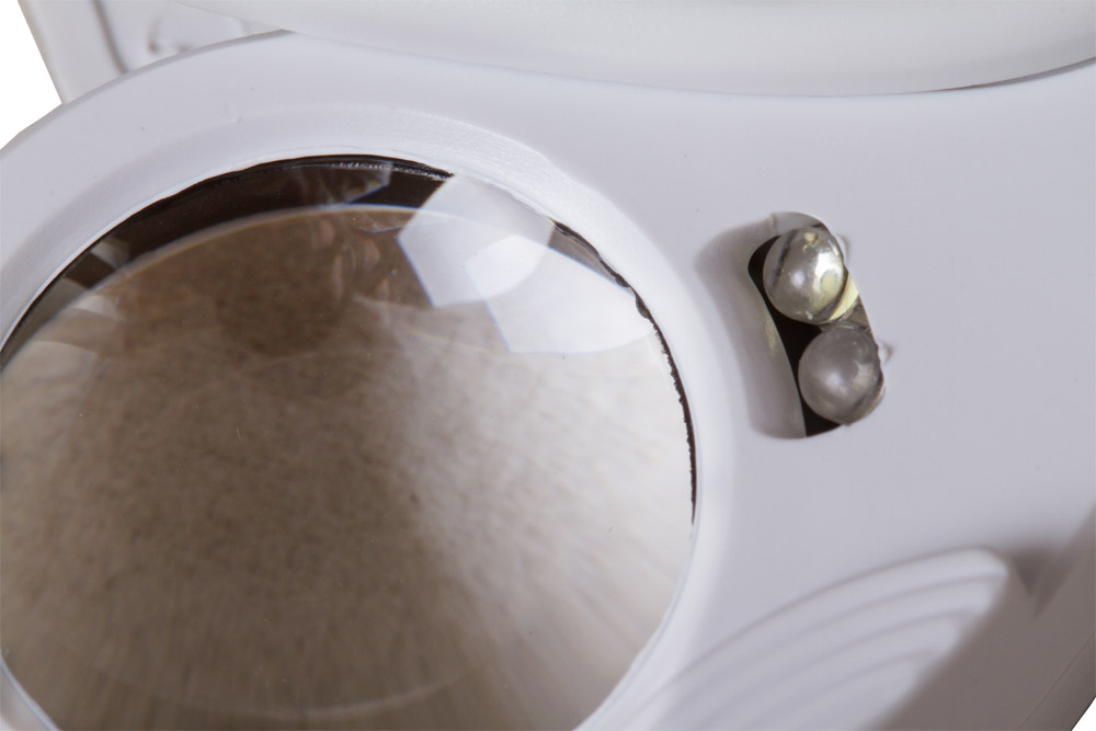 Основа прибора – это сдвоенная линза из оптического пластика с диаметром 25 миллиметров. Она формирует фиксированное увеличение 45 крат, при этом выдаёт практически идеальное изображение с минимумом вторичных дефектов. Компонент вставлен в комбинированный пластиковый корпус, являющийся одновременно оправой и ручкой для изделия. Основная часть прибора закладывается в эргономический накидной чехол, имеющий дополнительный внешний прорезиненный слой, улучшающий контакт с кожей рук и минимизирующий риски выскальзывания лупы при её активном использовании.