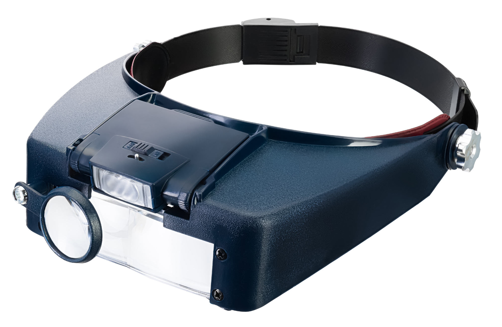 Лупа фиксируется на голове при помощи регулируемого крепления. Для работы подсветки требуются батарейки.