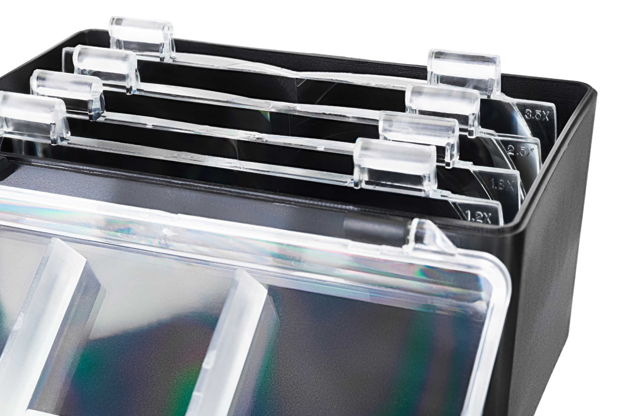 Линзы прямоугольные и рассчитаны на наблюдения сразу двумя глазами. Материал линз – полимерное оптическое стекло высокой степени прозрачности. Это прочный и долговечный материал, обеспечивающий передачу четкого и контрастного изображения. На лупу можно устанавливать или одну линзу, или сразу две (одну за другой).