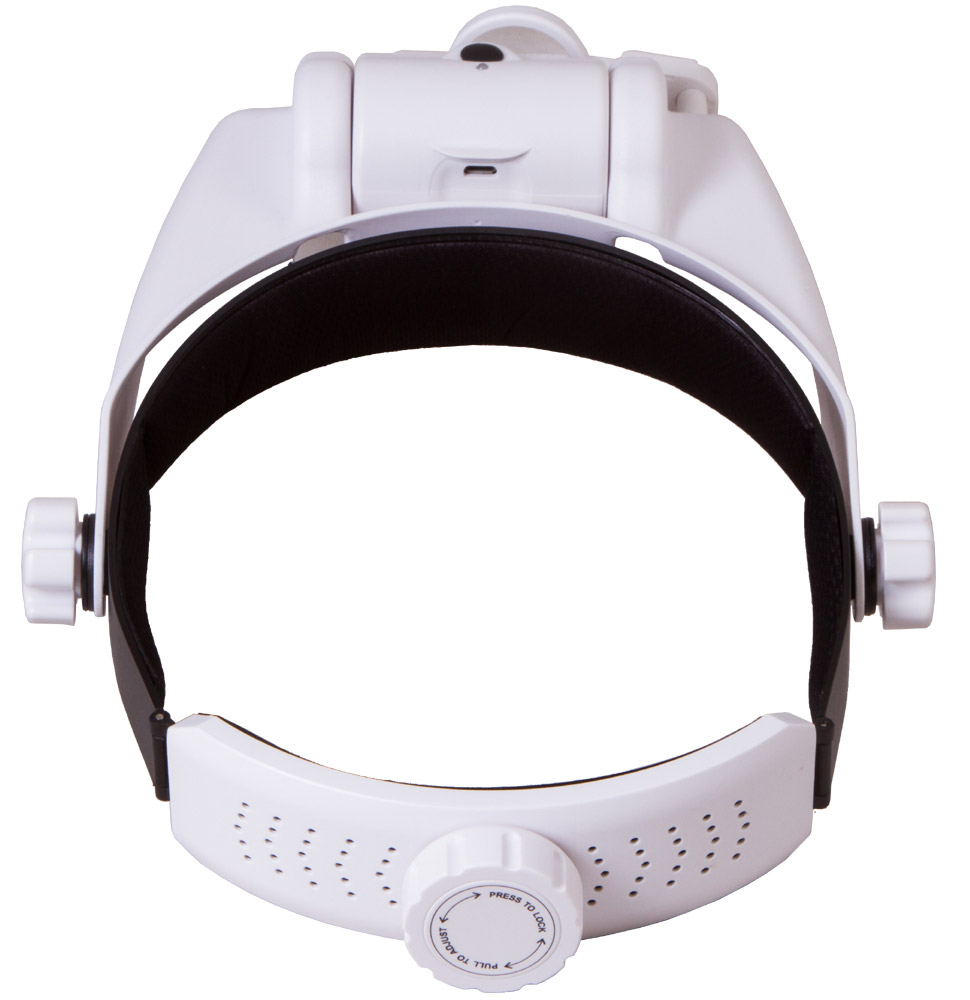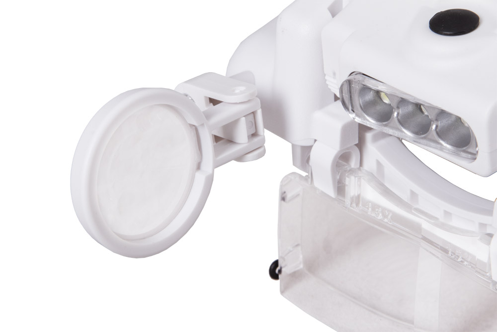Основная база аксессуара включает в себя две несъёмные зафиксированные прямоугольные линзы из оптического пластика, а также дополнительный компонент на прокручивающейся оправе для одного глаза. В совокупности, они формируют диапазон приближения от 1.5 до 8 крат без потери качества изображения. В центральной части устройства вмонтирован светодиодный модуль из трёх компонентов, работающий от ёмкостной аккумуляторной батареи. Его яркость регулируется (два режима свечения и отключение). Лупа легко фиксируется на голове удобным креплением и освобождает обе руки, упрощая манипуляции с мелкими объектами.