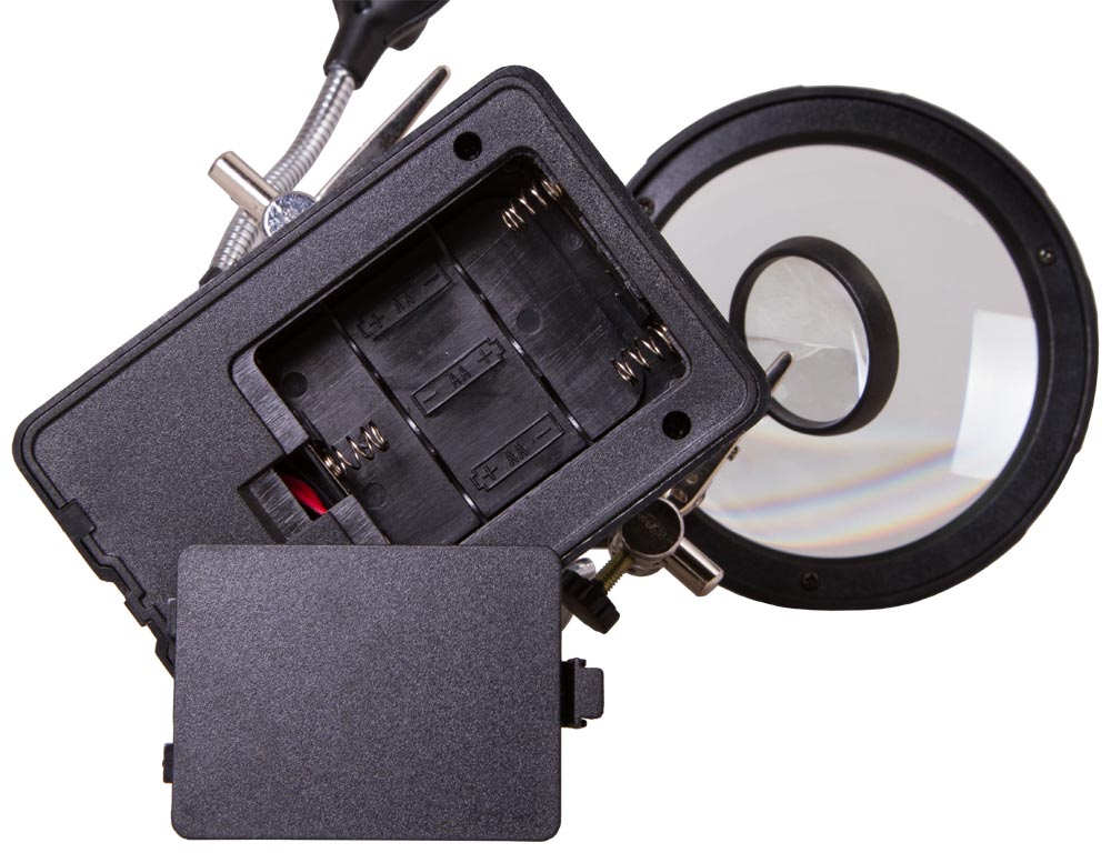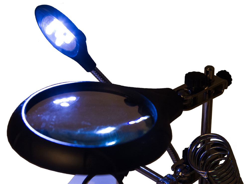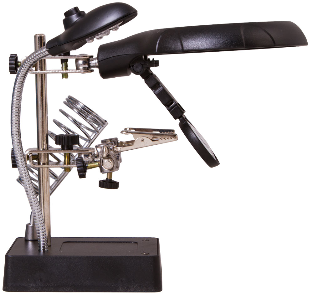 В качестве дополнительного удобства, настольная линза комплектуется модулем «третья рука». Съёмные держатели предопределяют возможность фиксации исследуемого объекта в нужной плоскости, облегчает работу с ним на протяжении длительного периода времени.