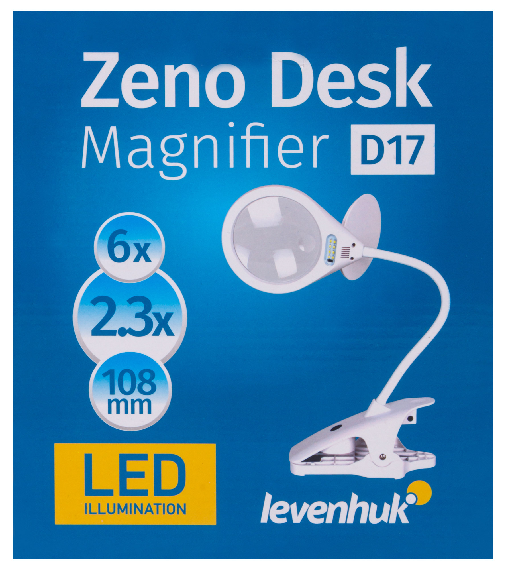 Levenhuk Zeno Desk D17 – удобная настольная лупа с большой бифокальной линзой, яркой LED подсветкой и прочной клипсой для фиксации устройства на полках, дверцах шкафов, краях столов и так далее. Подходит для любительского и профессионального использования.