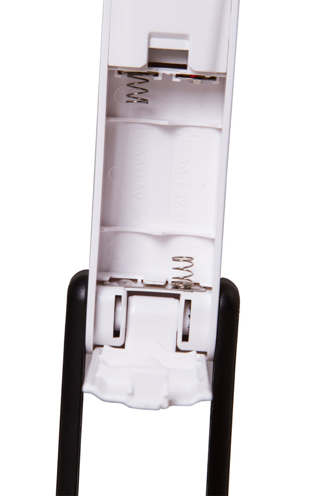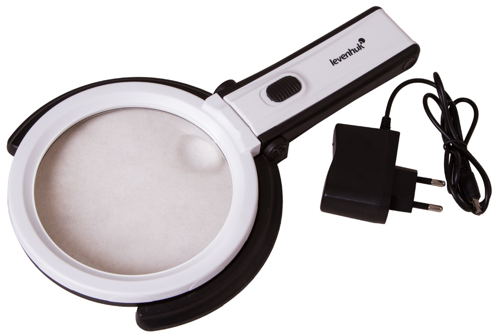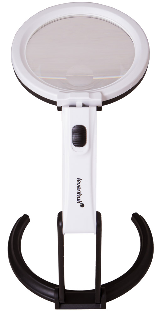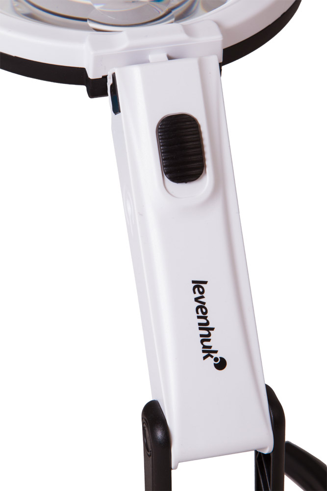 Элегантный штатив, на котором закрепляется основная часть прибора, состоит из двух частей. Первая является неподвижной. Вторая регулируется по углу наклона, завершается «рогообразным» основанием, удерживающим всю конструкцию на горизонтальной ровной поверхности. При необходимости штатив складывается и формирует классическую портативную лупу с широкой и длинной ручкой, которой удобно пользоваться в «полевых» условиях.