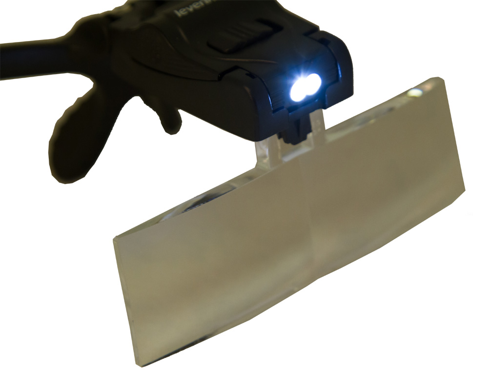 Лупа-очки Levenhuk Zeno Vizor G3 имеет встроенную подсветку и пять сменных линз из оптического стекла. Меняя линзы, можно получить 5 фиксированных увеличений в диапазоне от 1х до 3,5х. Подсветка яркая, светодиодная, с широкой областью охвата. При скудном внешнем освещении она поможет не прерывать работу и выполнять все манипуляции максимально аккуратно.