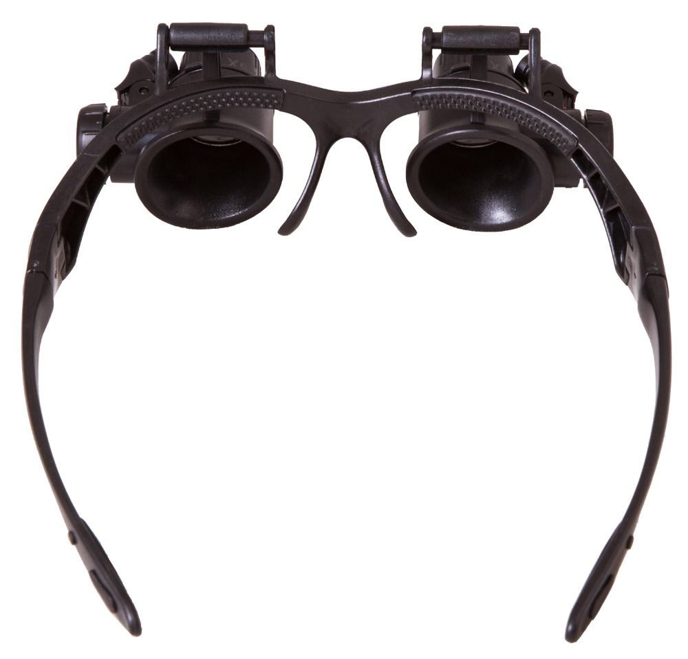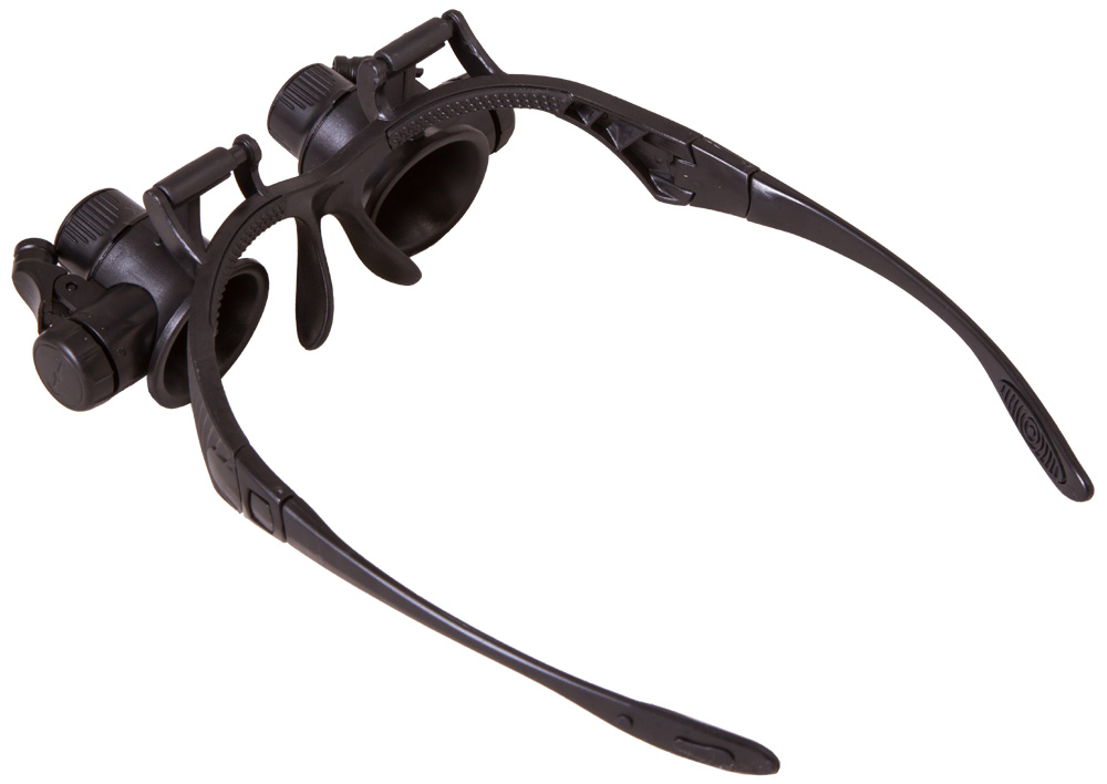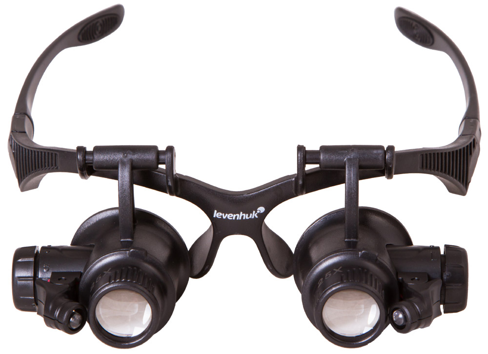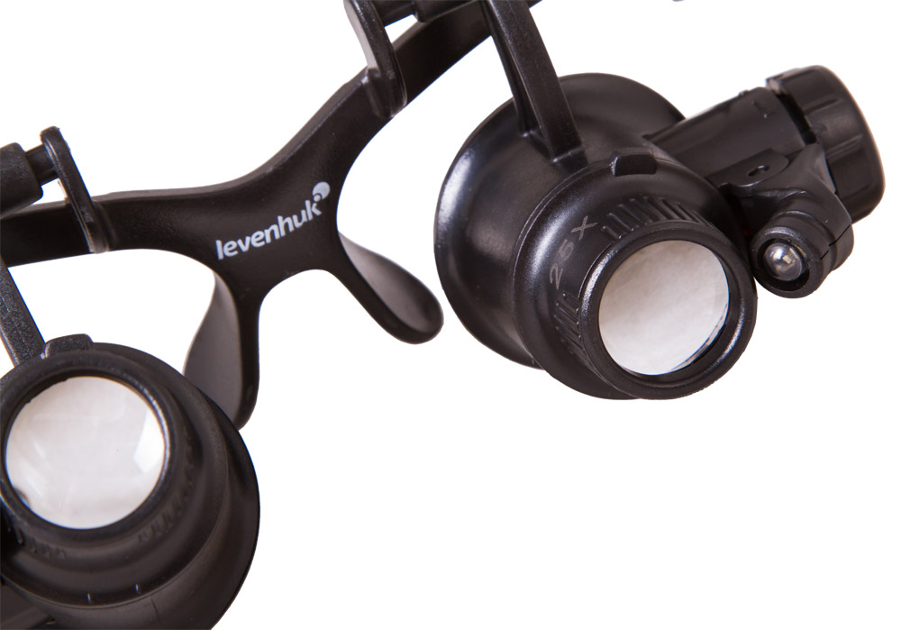 Базис лупы – группа линз из оптического пластика. Четыре комплекта спаренных элементов формируют соответствующую кратность приближения 10х/15х/20х и 25х. Два встроенных светодиода, расположенные с боков и функционирующие от батареек, предопределяют возможность удобной работы при недостаточном освещении. Окуляры изделия плотно прилегают к глазам, имеют регулировку межзрачкового расстояния. Эргономичная конструкция оправы позволяет работать с прибором на протяжении длительного периода времени без неприятных ощущений.