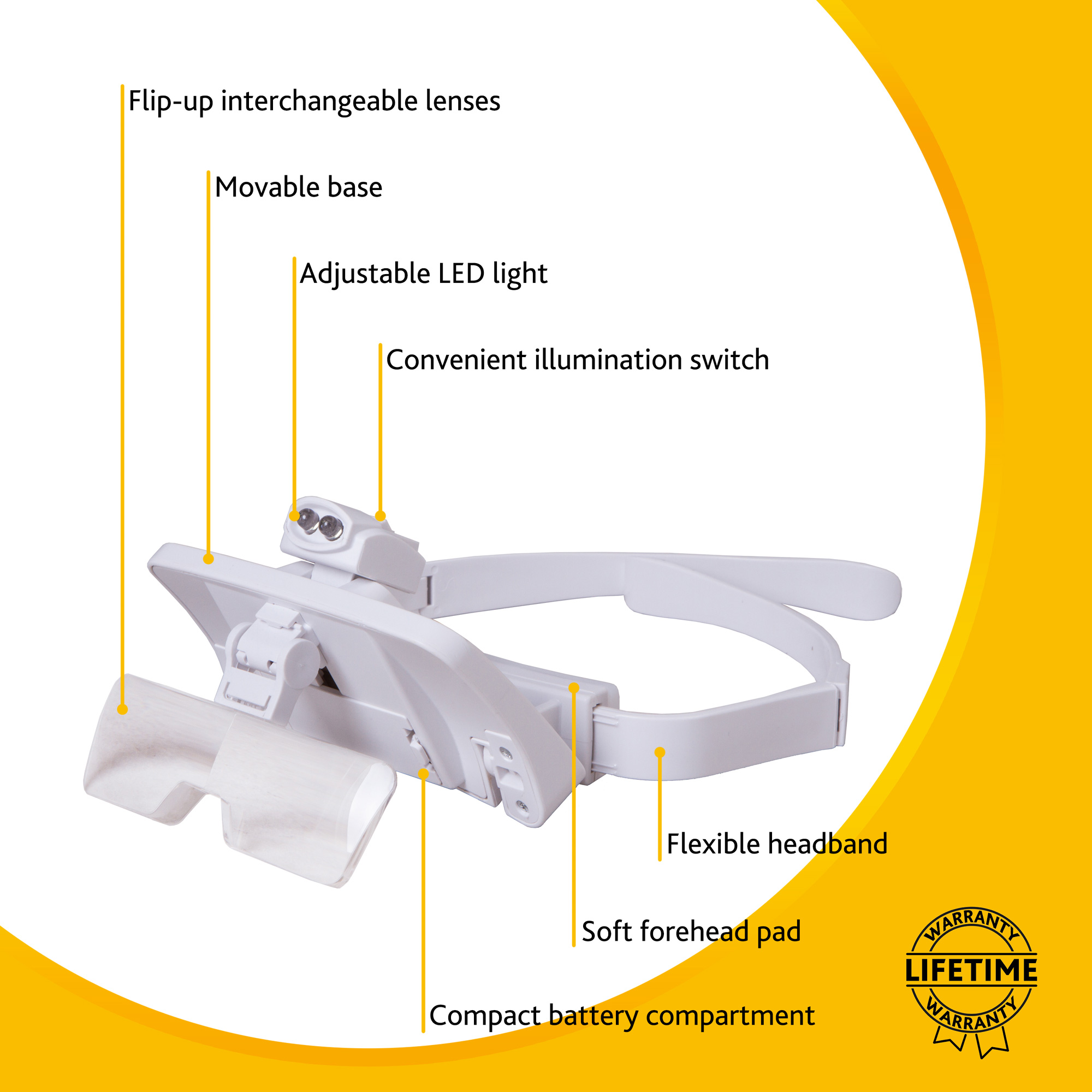 Базовый оптический модуль снабжен яркой светодиодной подсветкой, упрощающей работы при недостаточном внешнем освещении. Регулируемый затылочный ремень легко подстроить под любую голову.