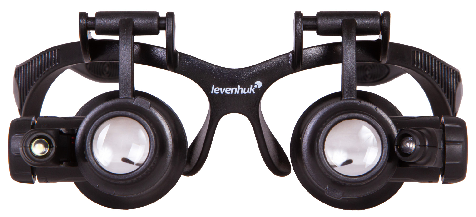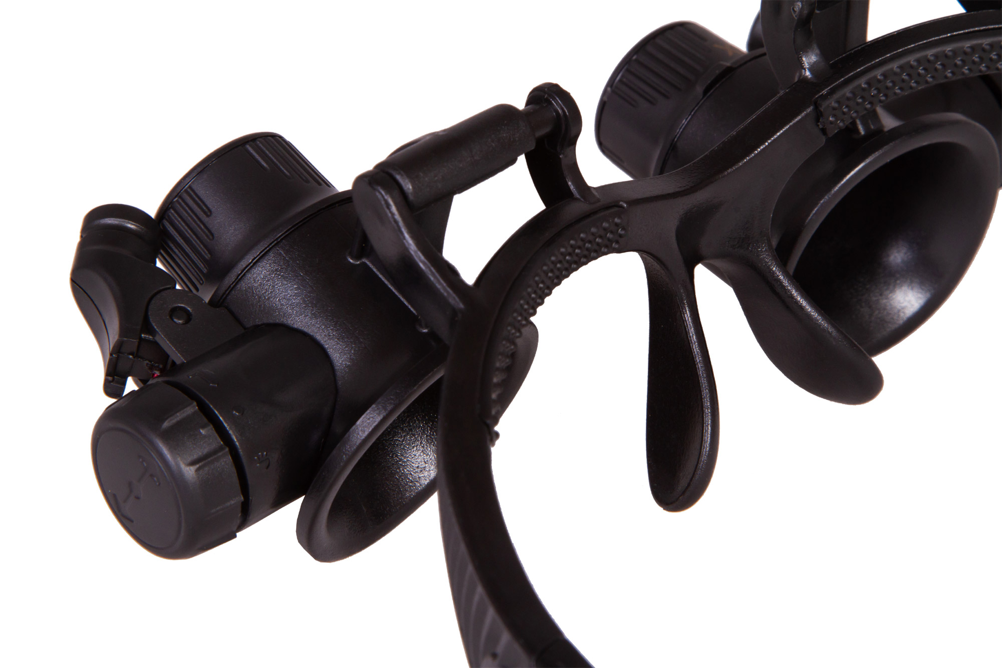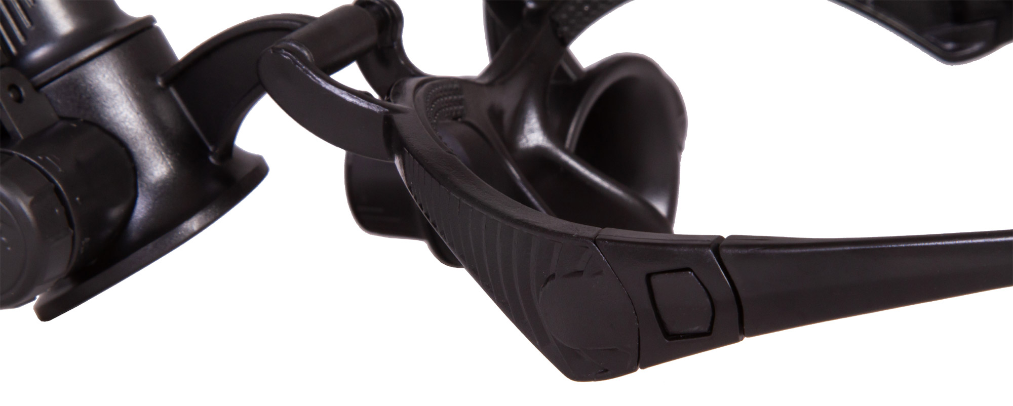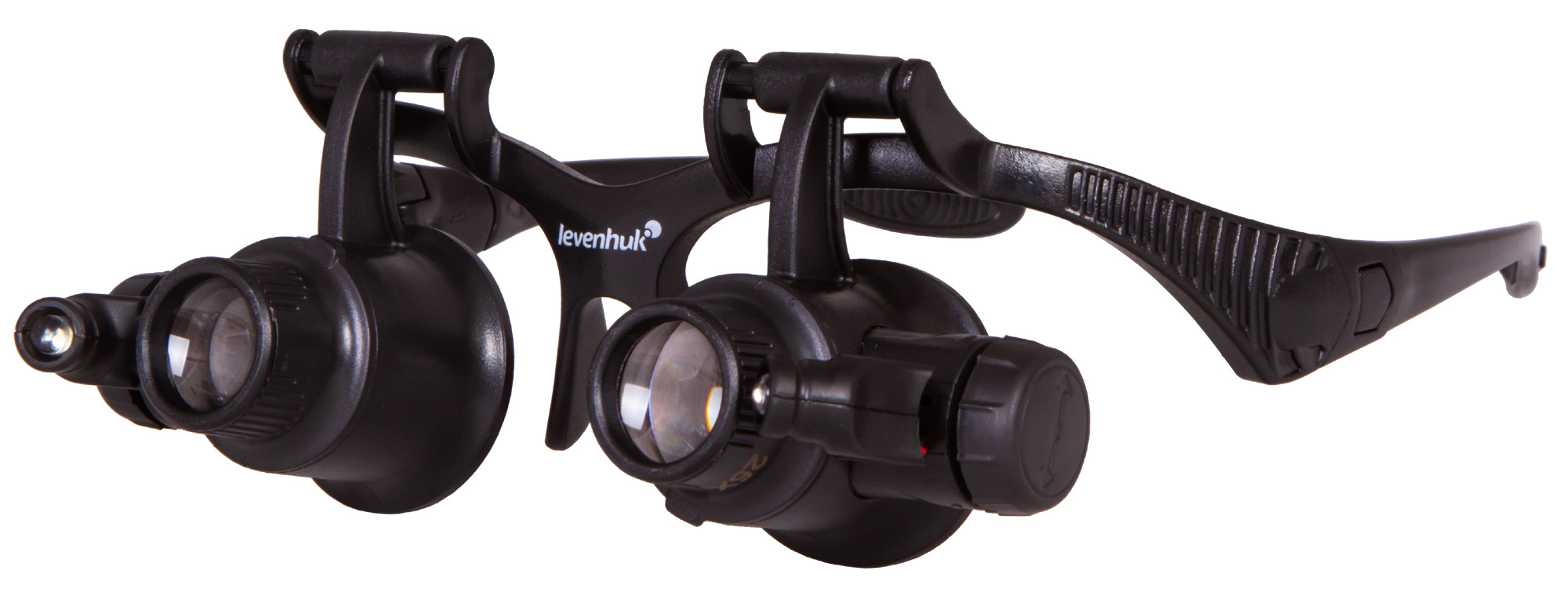 Главная особенность и одновременно ключевое преимущество этой модели – свободные руки мастера. Прибор обладает классической очковой оправой и комплектной тканной альтернативой, на которую закрепляются пары линз. В базовой поставке присутствует восемь комплектов парных элементов с диапазоном увеличения от 2.5 до 25 крат, что удовлетворит любые нужды даже в очень большой кратности приближения. По бокам изделия расположены светодиоды, запитывающиеся от комплектных батареек LR1130.