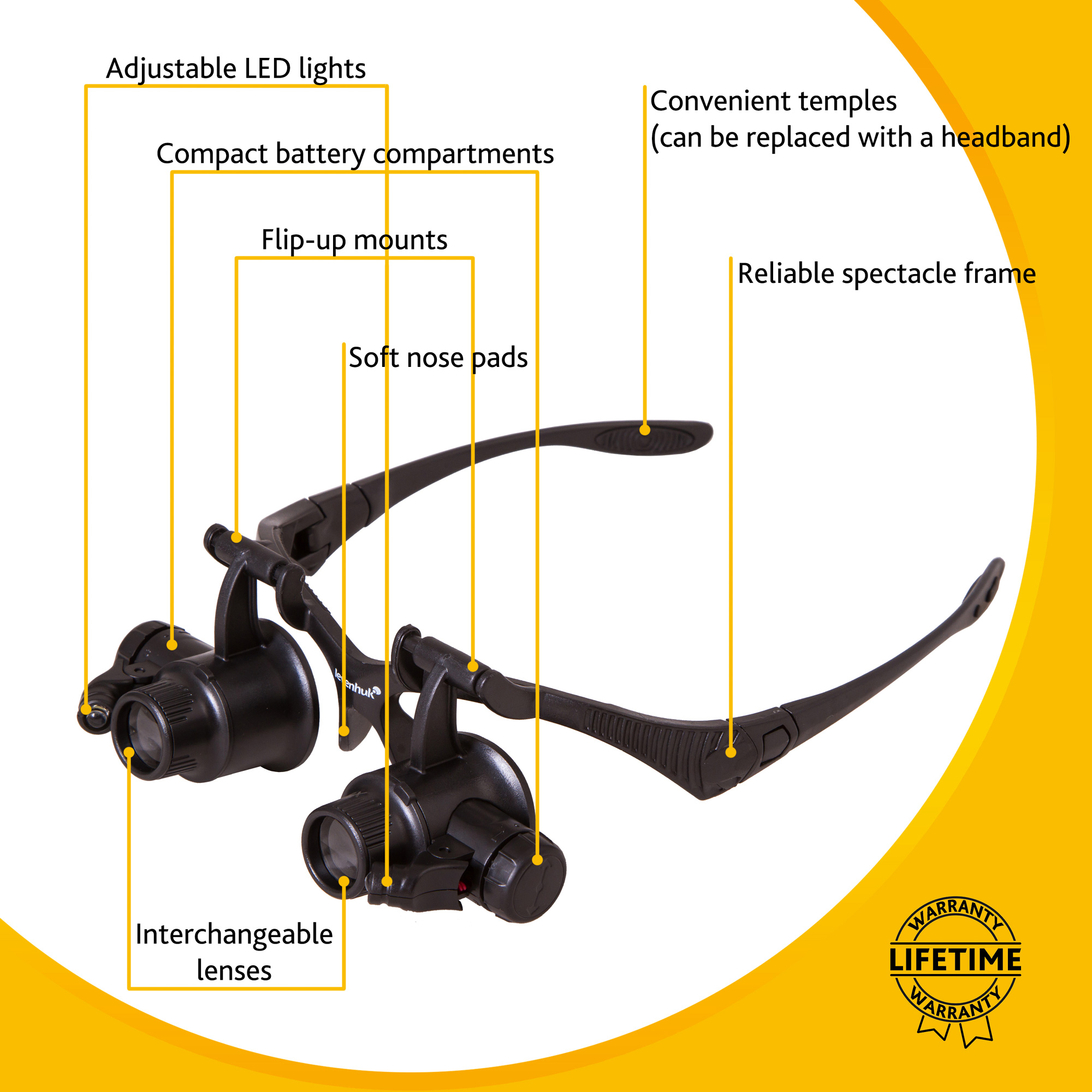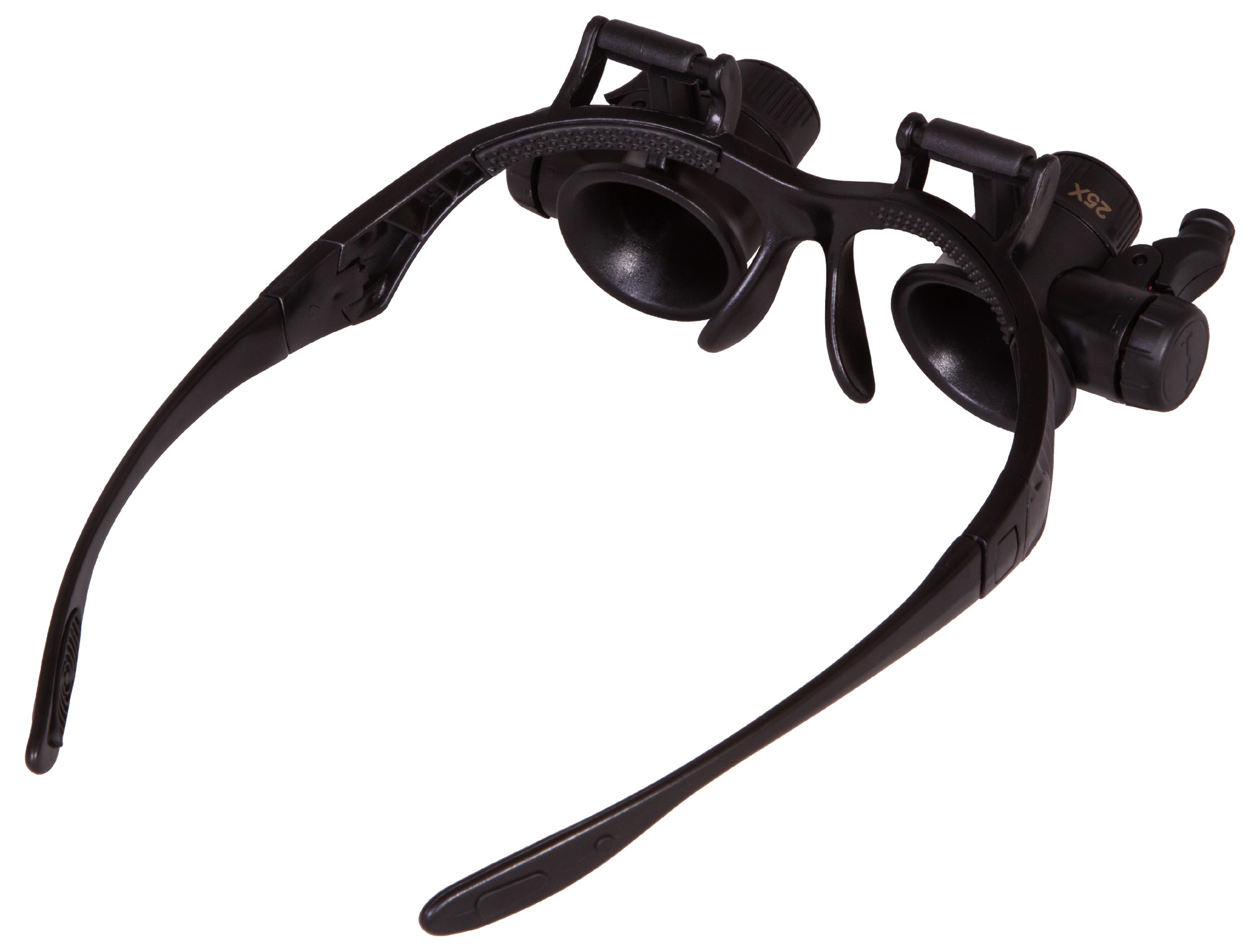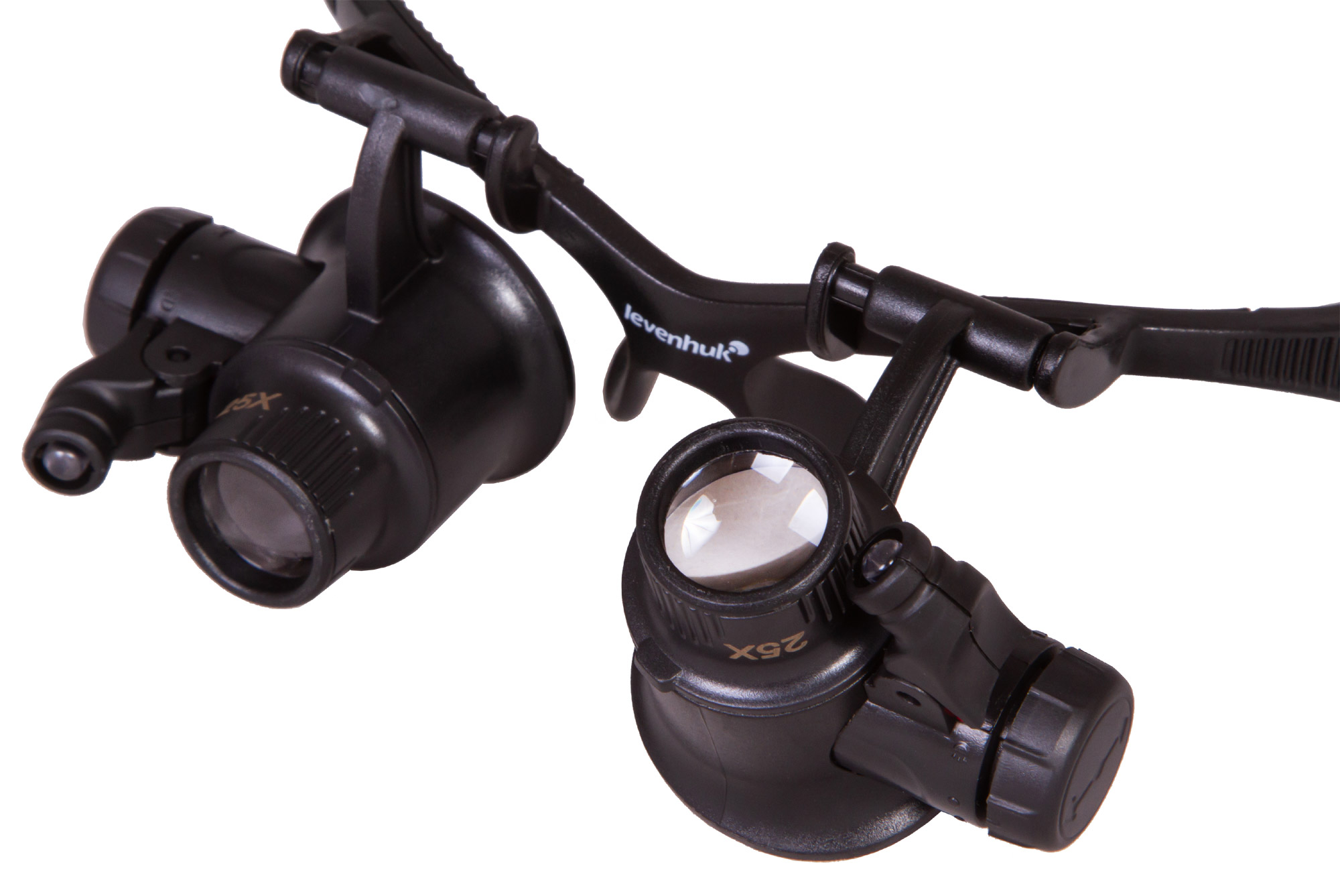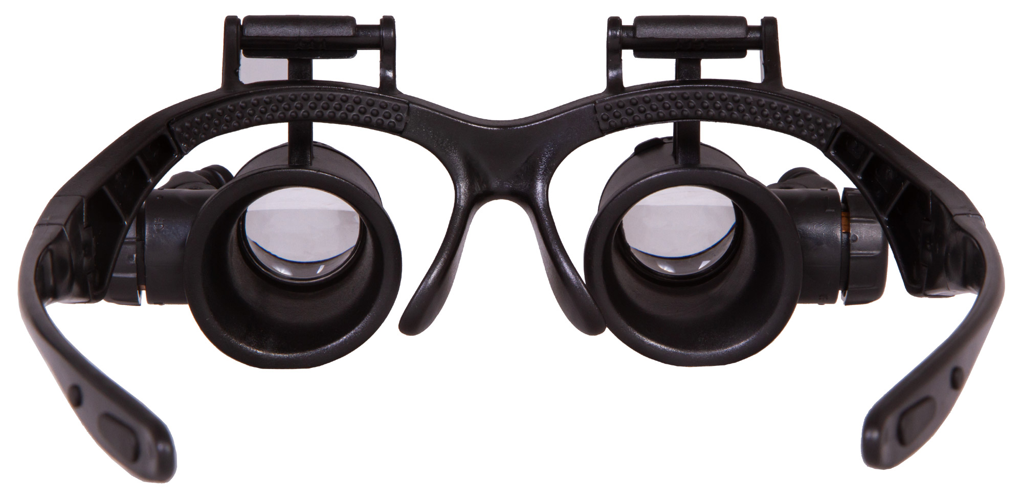 Главная особенность и одновременно ключевое преимущество этой модели – свободные руки мастера. Прибор обладает классической очковой оправой и комплектной тканной альтернативой, на которую закрепляются пары линз. В базовой поставке присутствует восемь комплектов парных элементов с диапазоном увеличения от 2.5 до 25 крат, что удовлетворит любые нужды даже в очень большой кратности приближения. По бокам изделия расположены светодиоды, запитывающиеся от комплектных батареек LR1130.