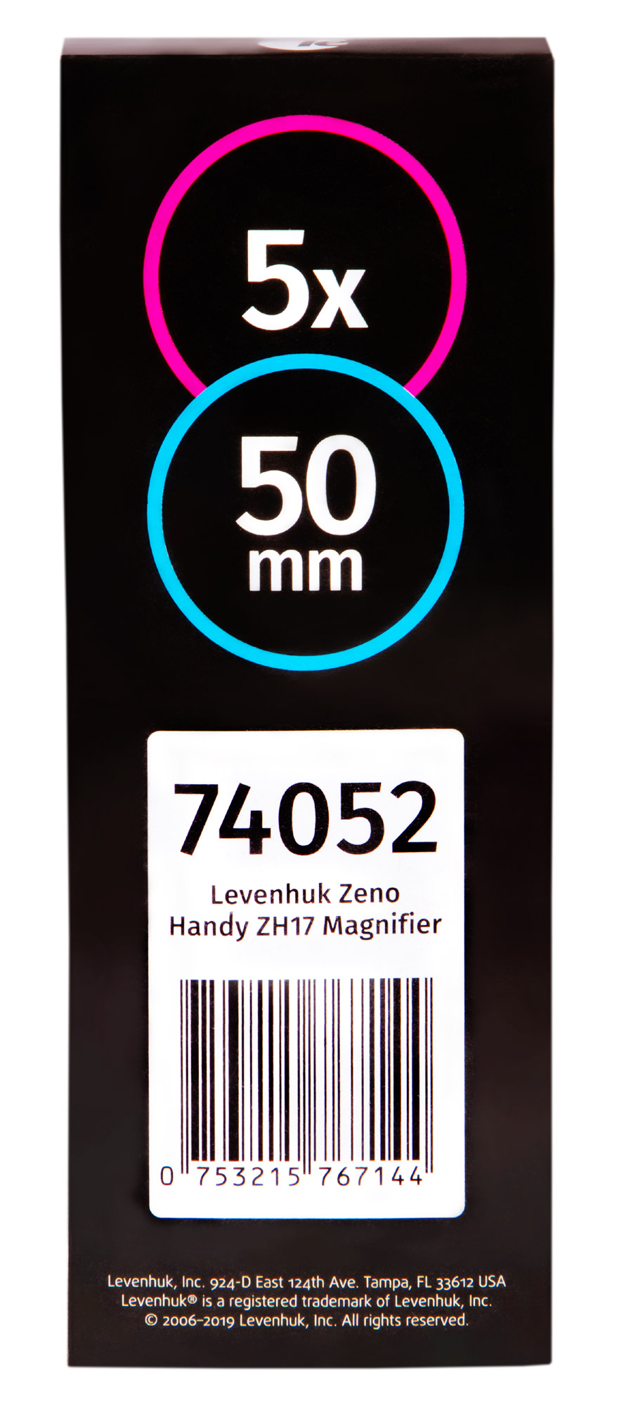 Levenhuk Zeno Handy ZH17 – просмотровая лупа для изучения мелких объектов работы с текстами и фотографиями. Она представляет собой линзу среднего размера (диаметр – 50 мм), сделанную из оптического пластика и помещенную в прочную металлическую оправу. Лупа дает 5-кратное увеличение и способна стать незаменимым помощником слабовидящему человеку.