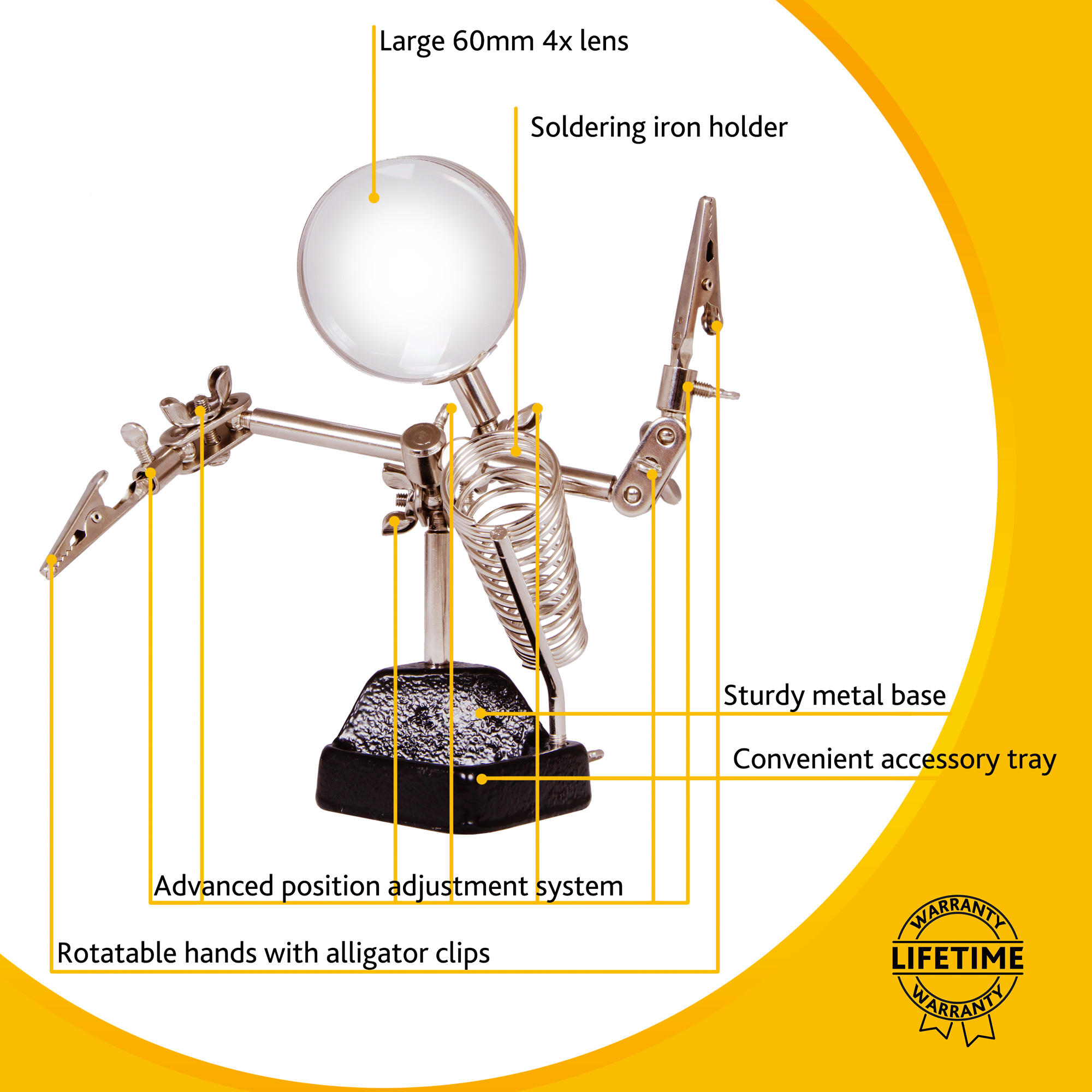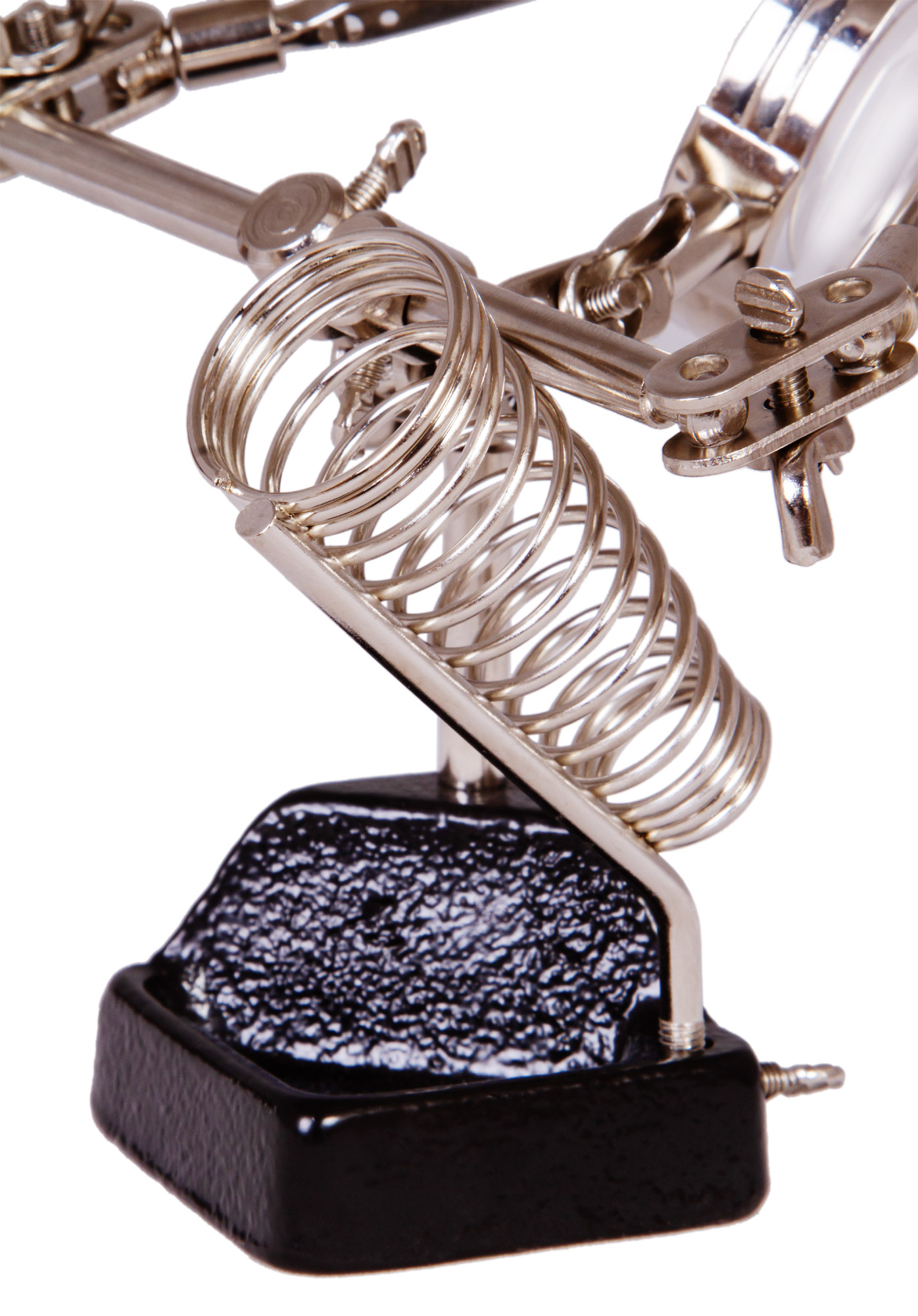 Линза штативной лупы Levenhuk Zeno Refit ZF11 дает 4-кратное увеличение. Она выполнена из оптического пластика, а оправа и корпус – из металла. Еще одно преимущество лупы – возможность перемещать линзу по горизонтали и наклонять под разными углами. В конструкции предусмотрен отдельный держатель для паяльника. В устойчивом основании лупы расположен лоток для размещения мелких деталей и инструментов.