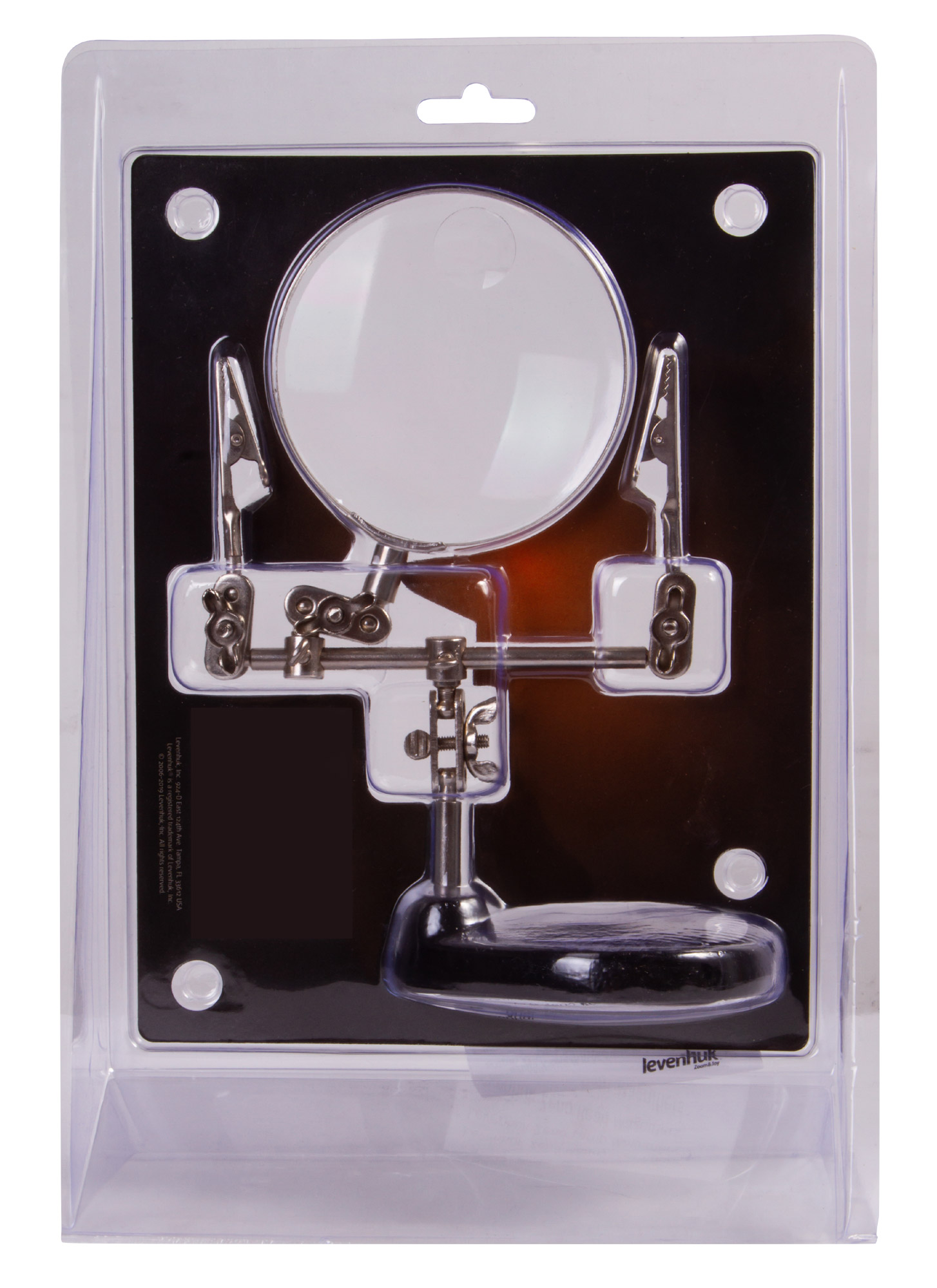 Большая базовая линза из оптического пластика с двукратным увеличением и диаметром 9 сантиметров гарантирует широкий угол обзора рабочего пространства. Она дополняется вторичным двухсантиметровым интегрированным аналогом с шестикратным приближением и вставлена в прочную металлическую оправу, зафиксированную на гибком штативе. Прочное качественное основание прибора надежно удерживает его на любой горизонтальной поверхности и содержит два держателя-«крокодила», упрощающих фиксацию обрабатываемых объектов на весу. В качестве дополнения тут присутствует удобный бокс, где можно хранить аксессуары и прочее мелочи.