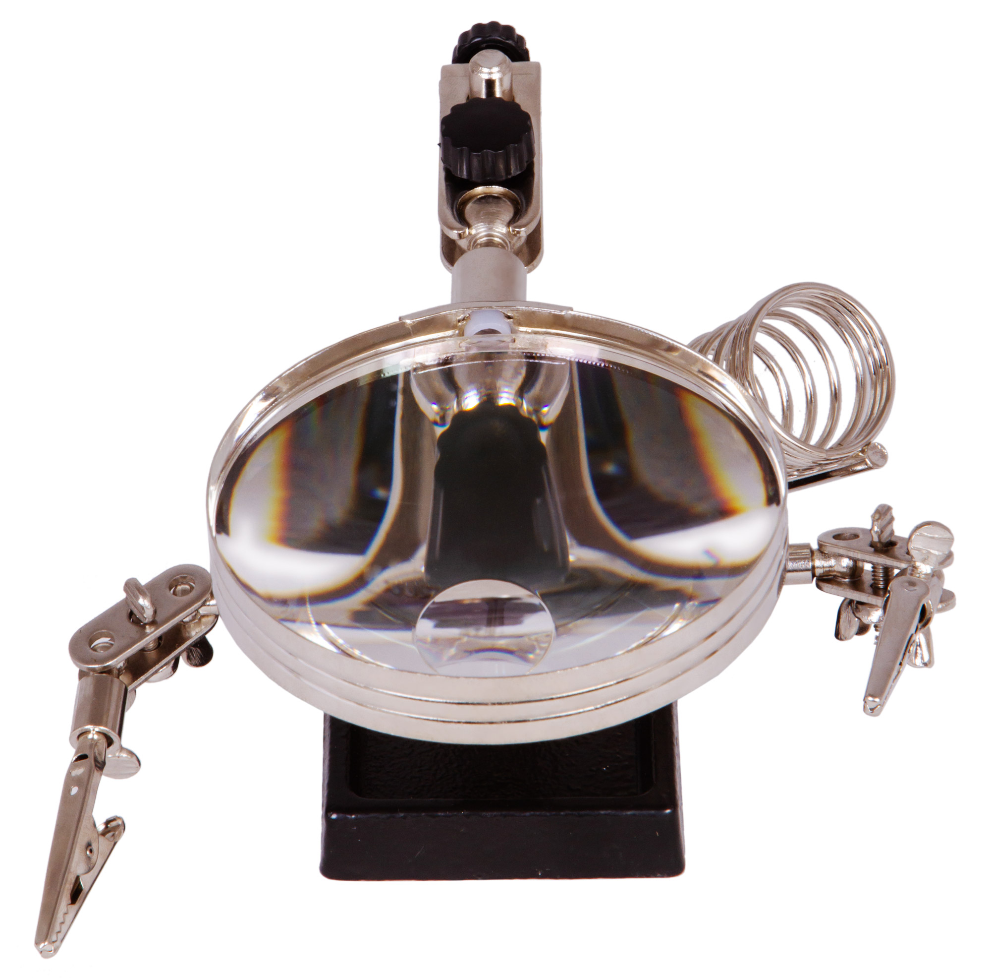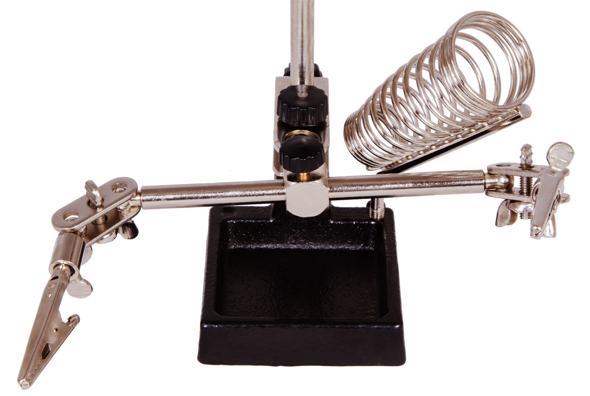 Помимо пары держателей с зажимами, в конструкции предусмотрен отдельный держатель для паяльника. Внизу находится лоток для мелочей, основание утяжелено во избежание случайного падения прибора.