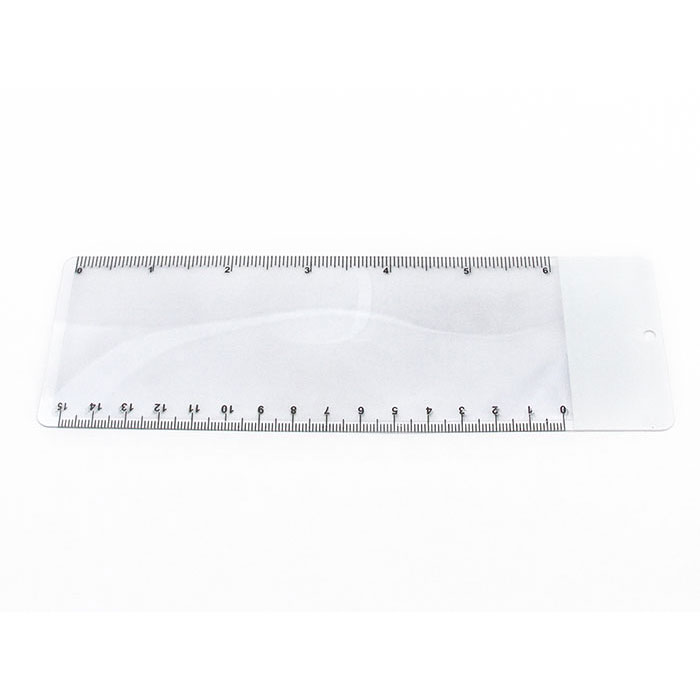 Линза Френеля с линейкой, шкалы проградуированы до 15 сантиметров и до 6 дюймов. Увеличение 3х, размер 190x65 мм.