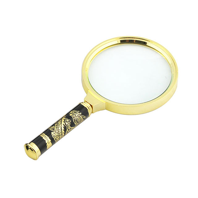 Лупа выполнена в оправе "под золото". На черной ручке выгравировано изображение дракона.