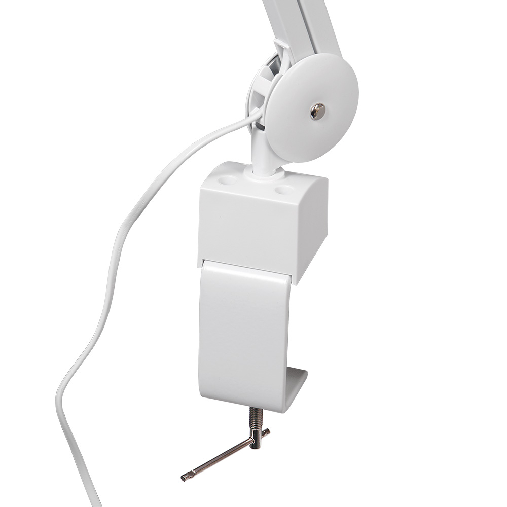 Для фиксации на столешнице или любой другой поверхности предназначена стальная струбцина. Максимальная толщина столешницы для установки струбцины составляет 74 мм. Пантограф с осветителем вставляется в отверстие струбцины и может свободно вращаться в ней. Для напольной установки осветителя дополнительно можно приобрести напольный штатив на колёсиках.