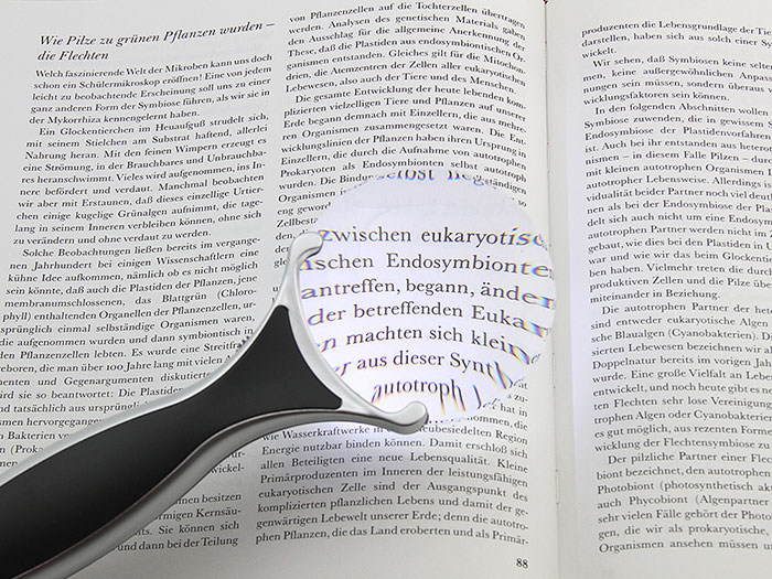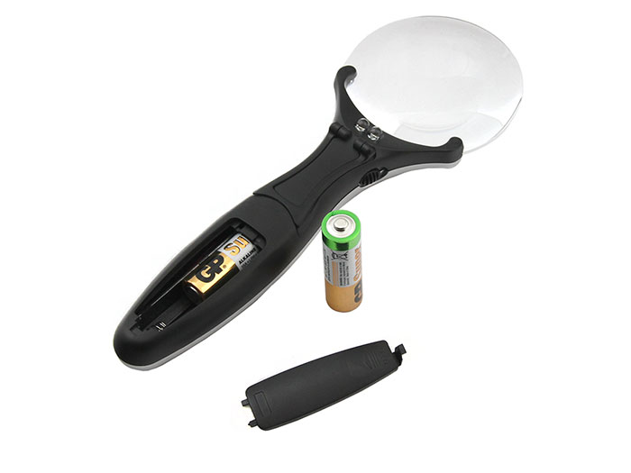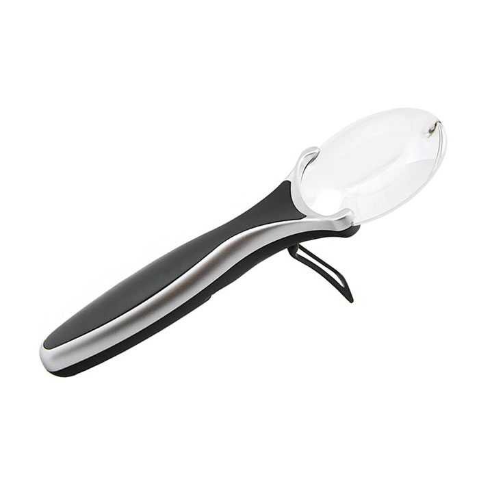 Конструкция лупы содержит выкидную подпорку для установки на плоскую поверхность.