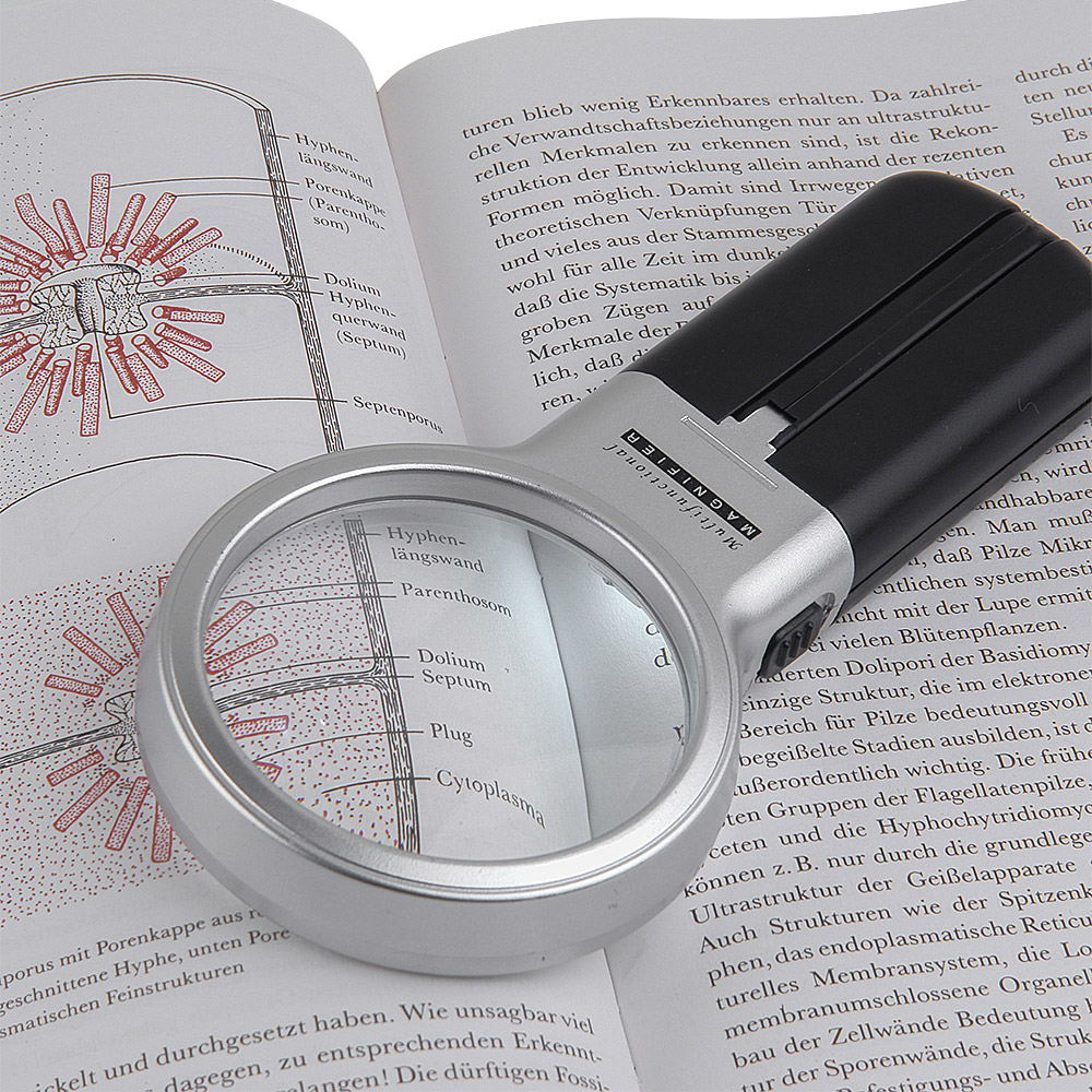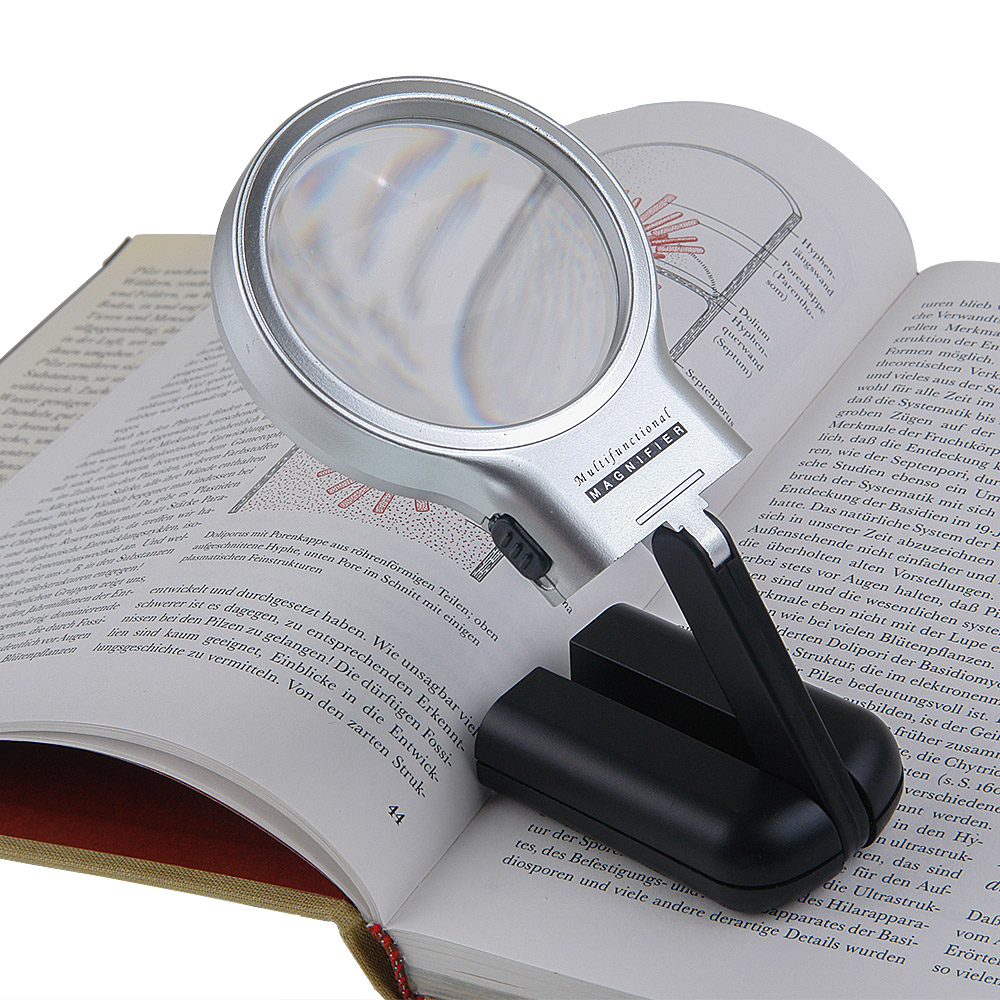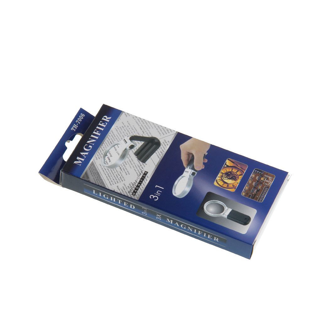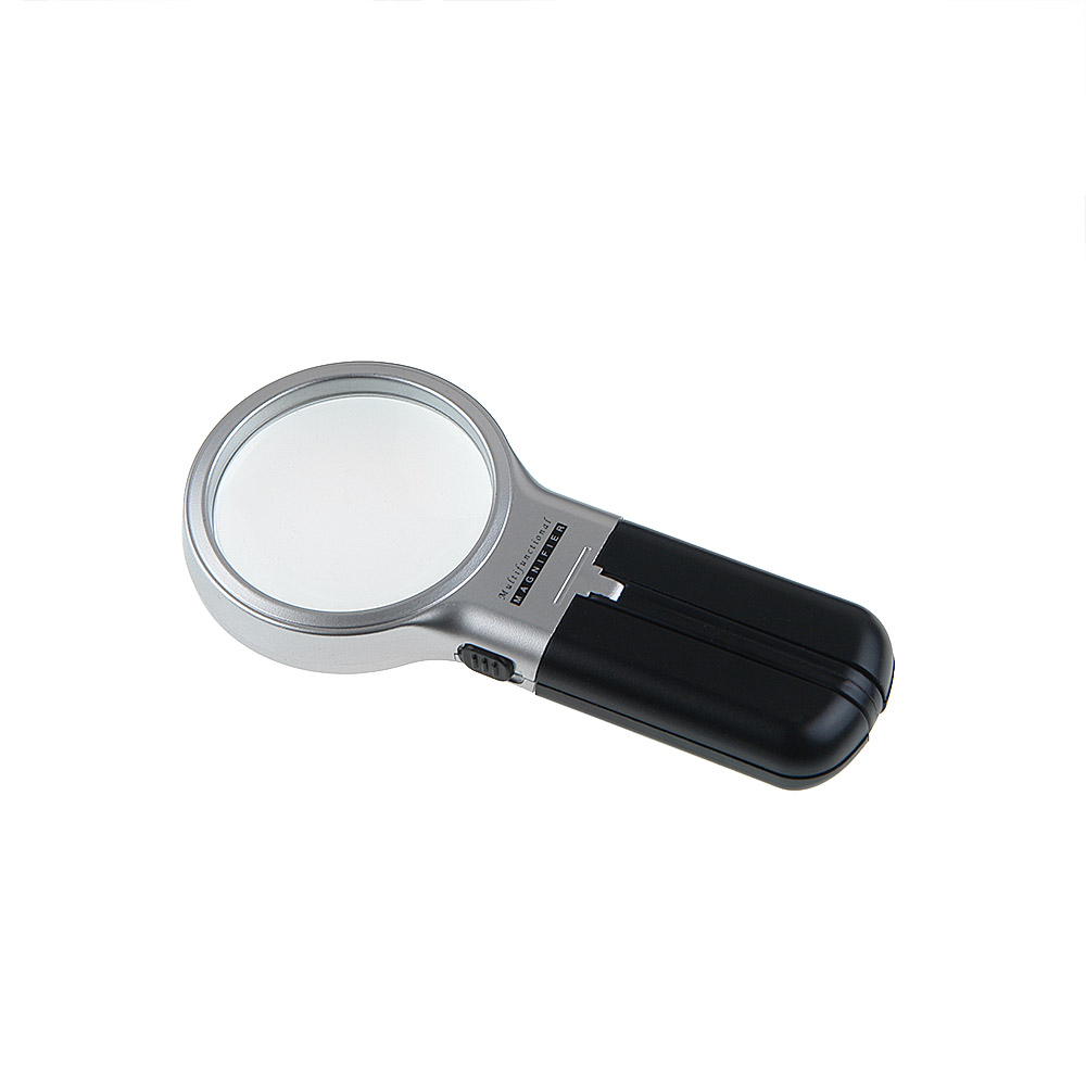 Многофункциональная лупа Veber 7006 с кратностью 3х и диаметром линзы 62 мм имеет светодиодную подсветку с питанием от двух батареек типа АА. Конструкция лупы включает в себя шарнир, с помощью которого её можно поставить на стол и наклонить под необходимым углом к наблюдаемому объекту. В сложенном виде основание с батарейками можно использовать как рукоятку.