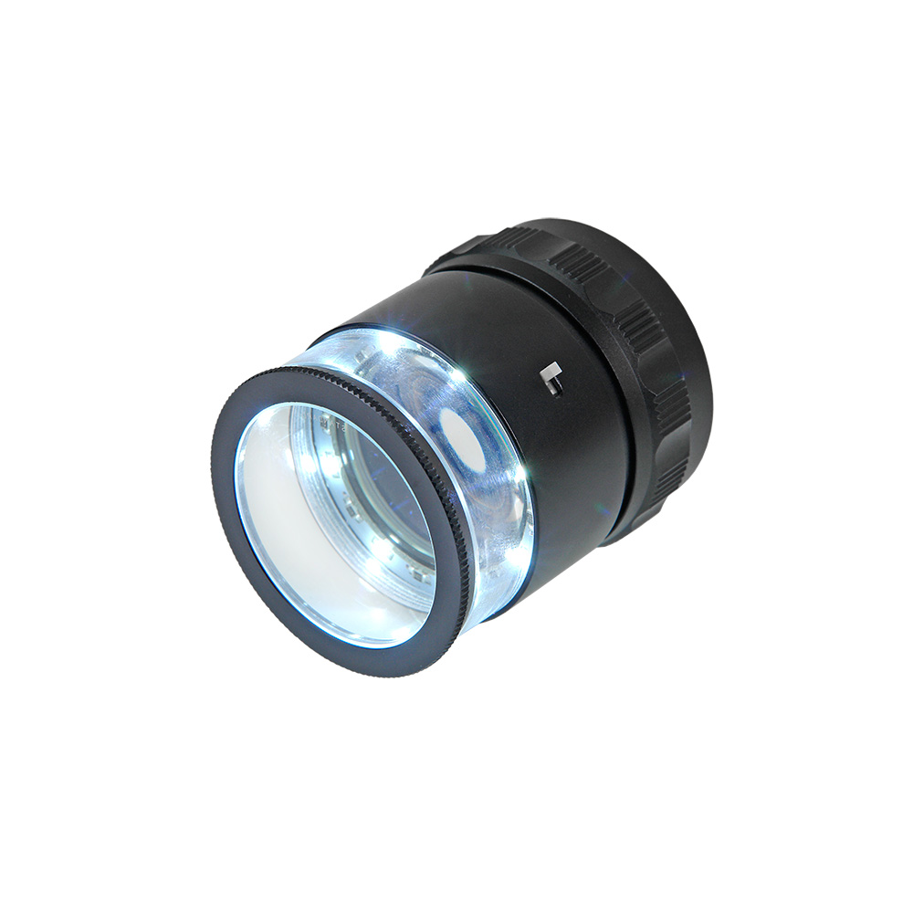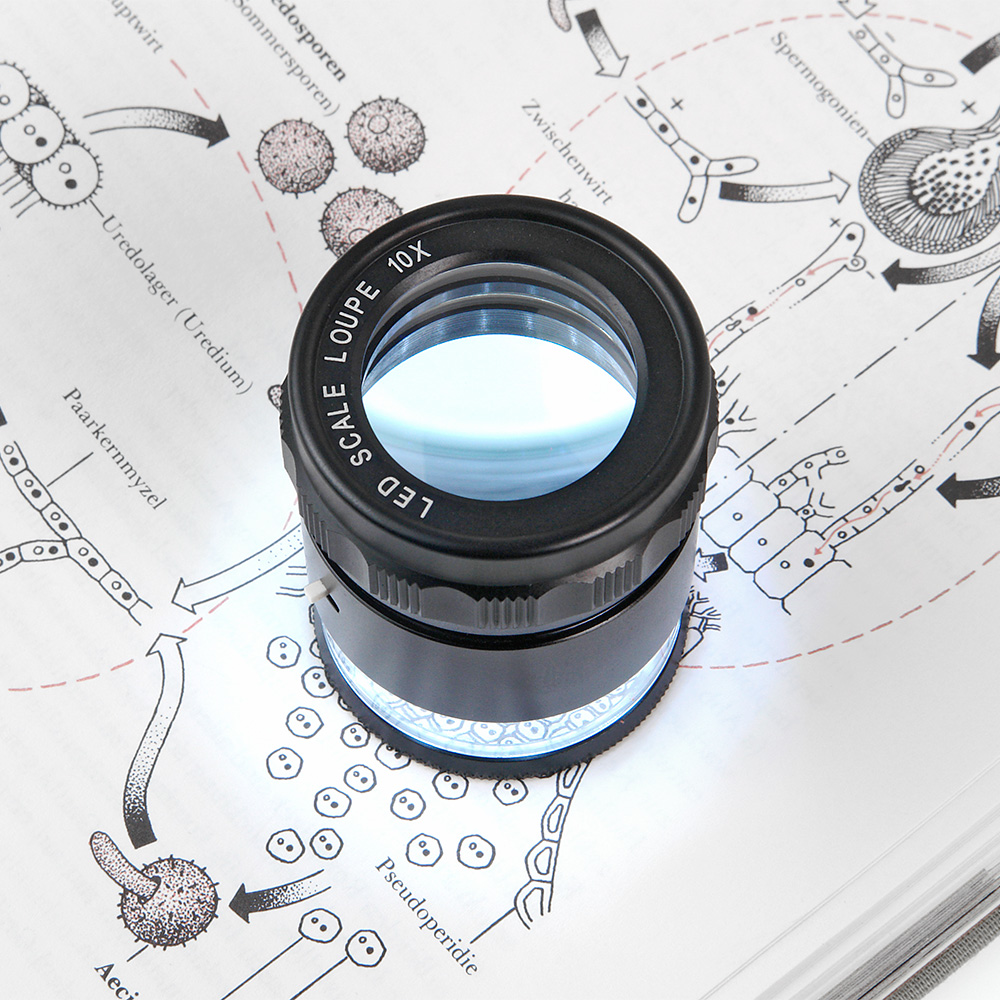 Измерения могут быть осуществлены как в дневном, так и искусственном (LED подсветка) свете с увеличением в 10 крат и с точностью 0,1 мм. Корпус лупы изготовлен из силумина с гальваническим покрытием. Подсветка осуществляется с помощью 8 микросветодиодов, расположенных у основания металлической части корпуса. Включение подсветки осуществляется тумблером на корпусе лупы. Батареи сменные (батарейки типа L936F 4 шт, в комплекте), рассчитаны на весь срок службы изделия. Высота прозрачной части корпуса (пластик) — 11 мм. Шкала (стекло, в металлической оправке, нанесена методом фотолитографии, трудноистираемая) крепится на резьбе снизу к прозрачной части корпуса. Для дополнительной защиты лупа снабжена пластиковой крышкой.