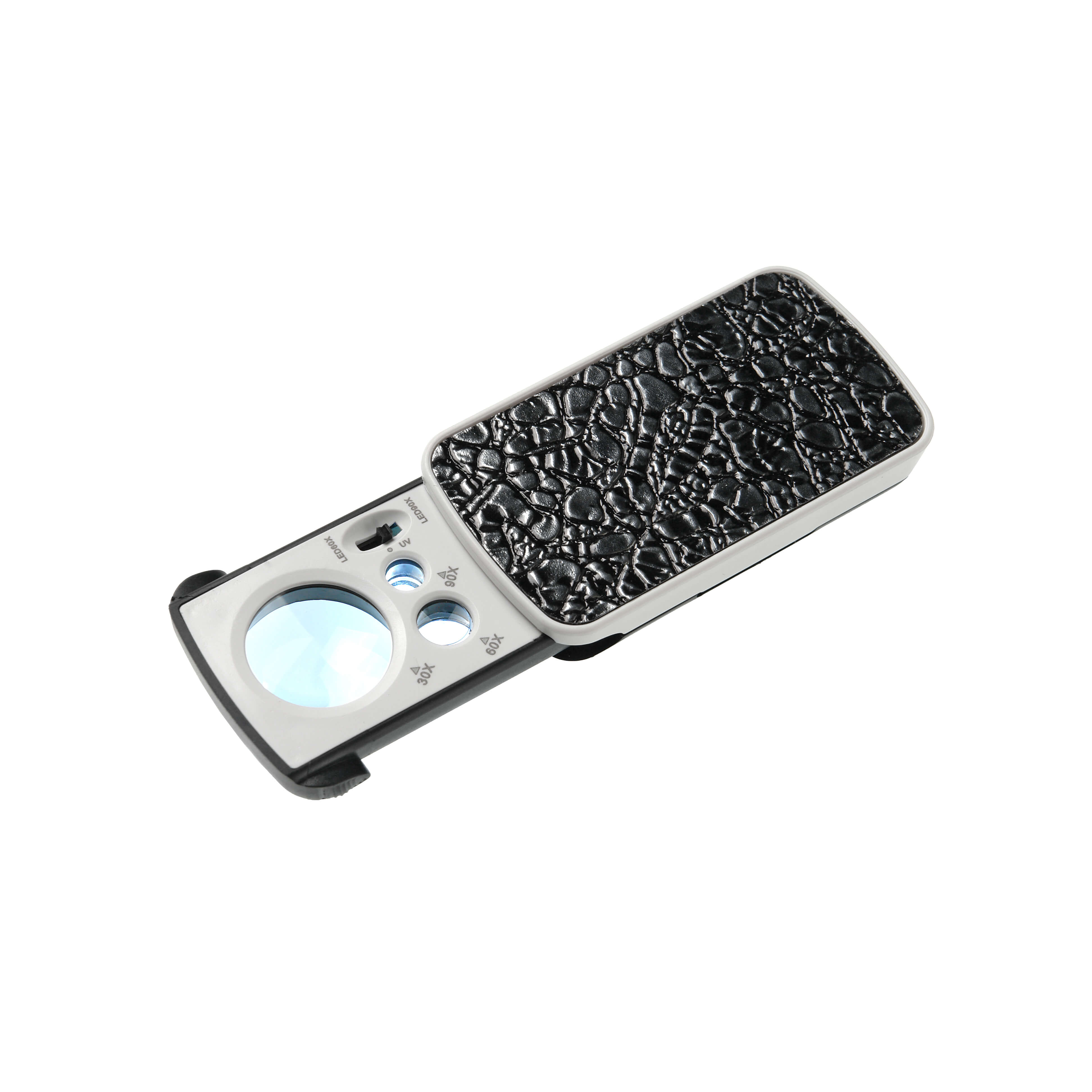 Корпус лупы и оправа изготовлены из пластика. Оправа с линзами сдвигается внутрь корпуса, при этом, в сложенном состояние лупа занимает место не больше спичечного коробка. Подсветка автоматически включается при выдвижении блока с линзами в крайнее положение. Сверху на оправе предусмотрен переключатель подсветки: подсветка поля 10-кратной линзы, подсветка поля 30-кратной линзы и УФ подсветка (только для поля зрения 10-кратной линзы).
