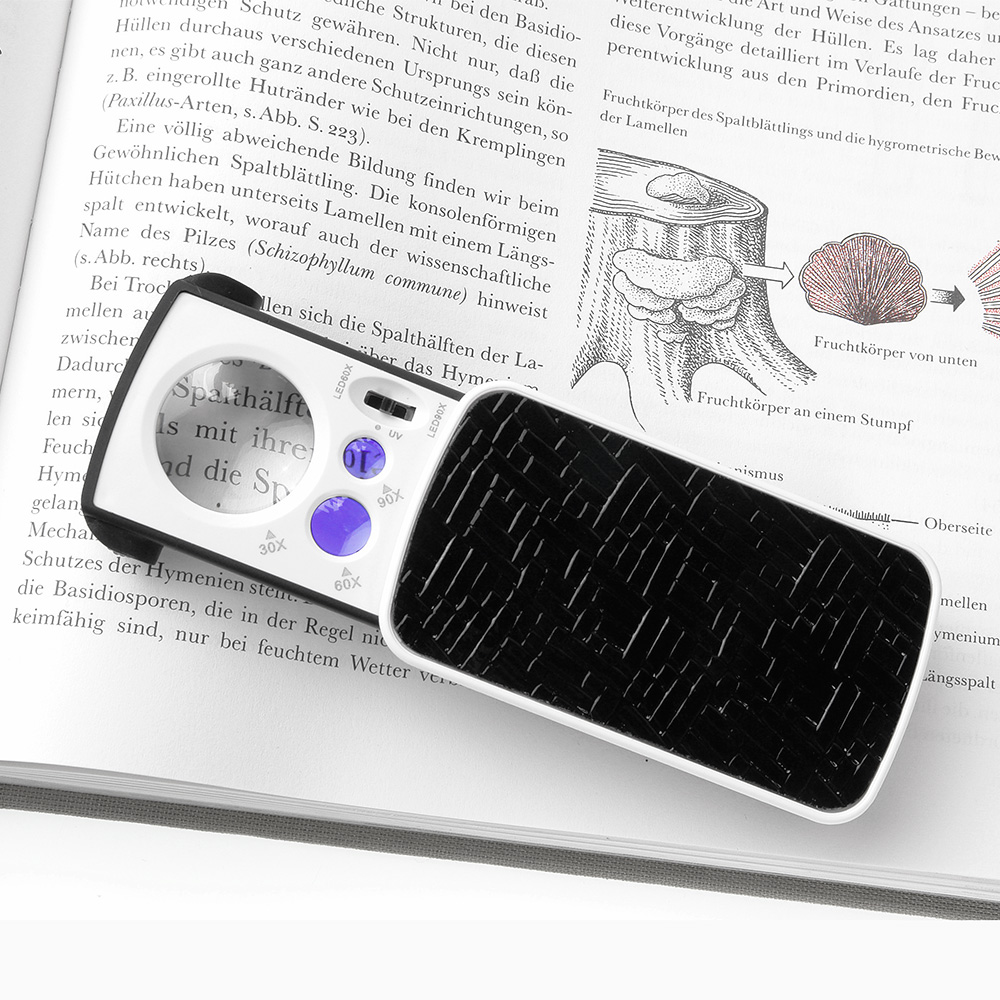 На нижней части оправы расположены три светодиода. Светодиод УФ подсветки предназначен для проверки, например, купюр. Подсветка светодиодами белого цвета значительно улучшает условия «рассматривания» предметов, так как, ввиду большого увеличения этих линз, требуется достаточное освещение их поля зрения (что бы объект не выглядел слишком тёмным).