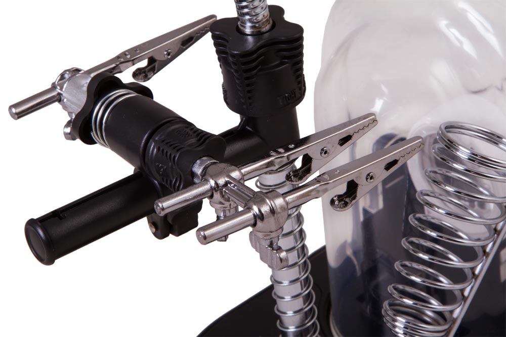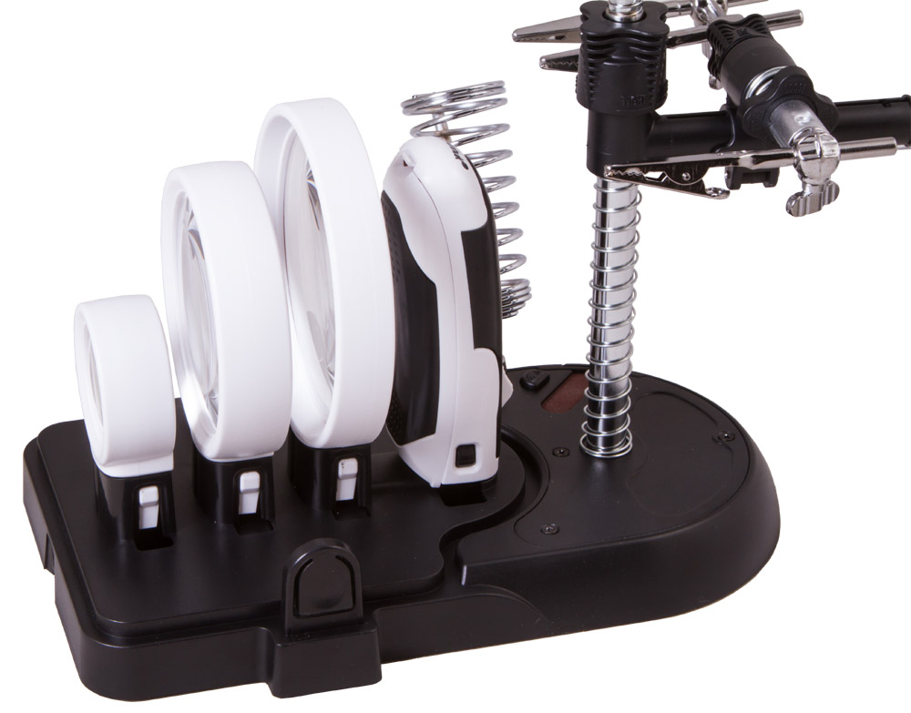 Это устройство – настоящий «комбайн» и отличная находка для людей, которые ищут действительно практичную и удобную мультилупу! Изделие обладает очень прочным и устойчивым основанием, снабженным гибким штативом, куда можно дополнительно подвешивать разнообразные сменные аксессуары в виде линз, плафонов подсветки. Имеется здесь очень необходимый многим модуль «третья рука» со штангой и держателями, в базу которого легко вставляется удерживатель под паяльник. Отдельно в наборе присутствует удобная портативная ручка с возможностью установки линз.
