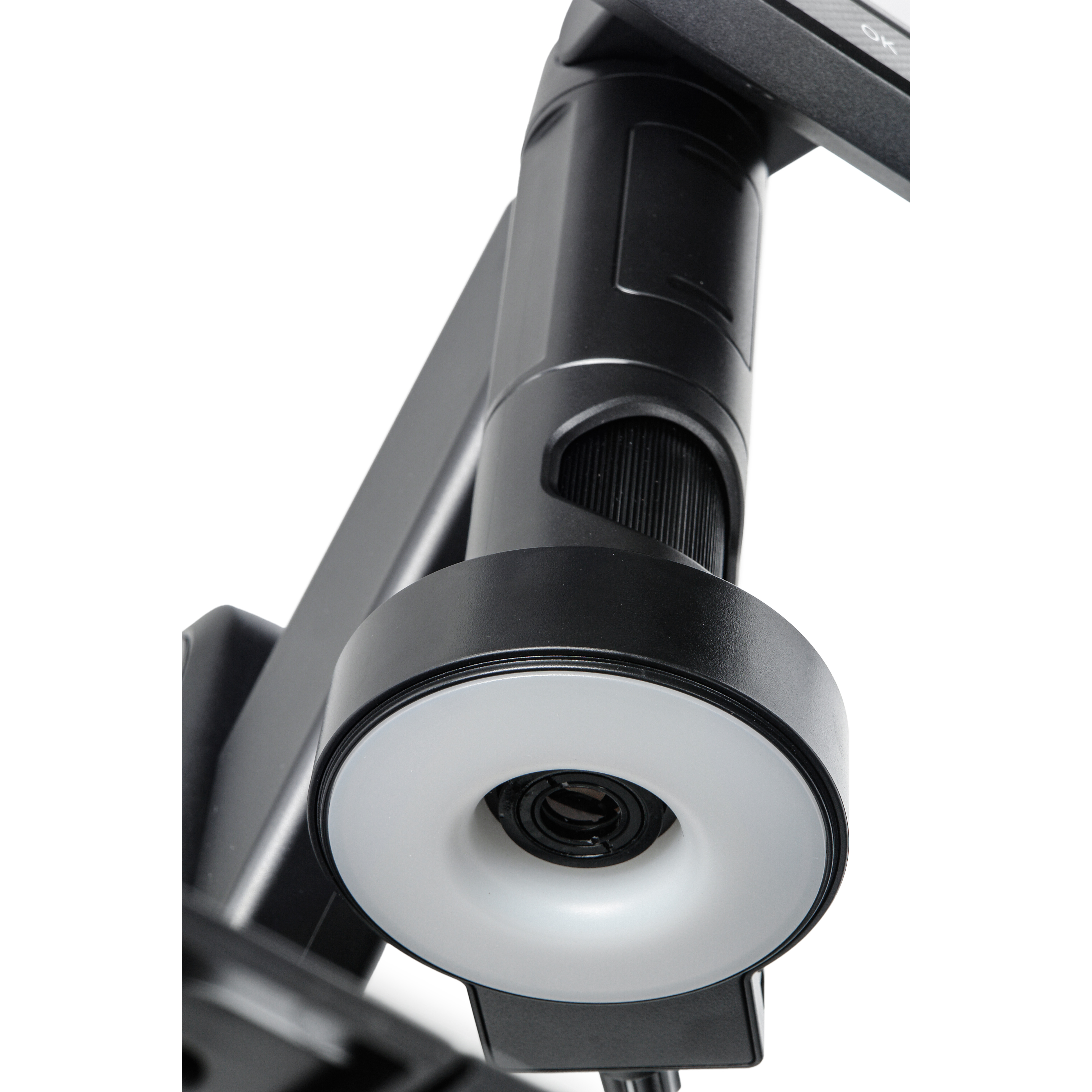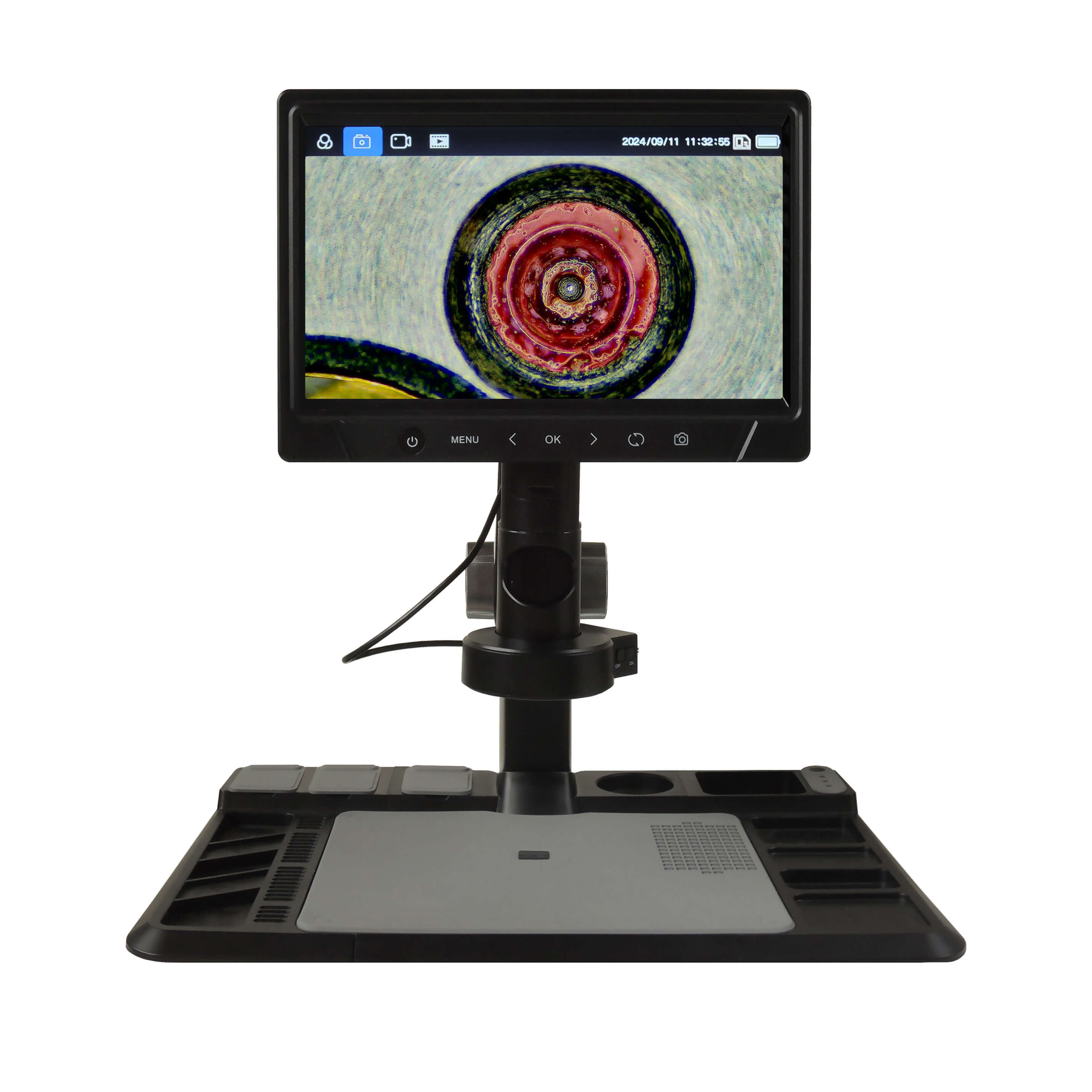 В микроскопе используется монитор формата 16:9 с диагональю 10.1 дюймов на IPS матрице с разрешением 1024х600 точек. Применение жидкокристаллической матрицы c технологией IPS позволяет наблюдать отчетливое изображение с углами обзора до 170 град. без затемнения, что позволяет участвовать в исследованиях нескольким лицам и проводить наблюдения с комфортом и без чрезмерного напряжения. Монитор обеспечивает высокую яркость, контрастность и точное воспроизведение цветов изображения. На корпусе монитора расположены кнопки всех основных настроек, слот для карты памяти и интерфейсы USB2.0 и USB Type С.