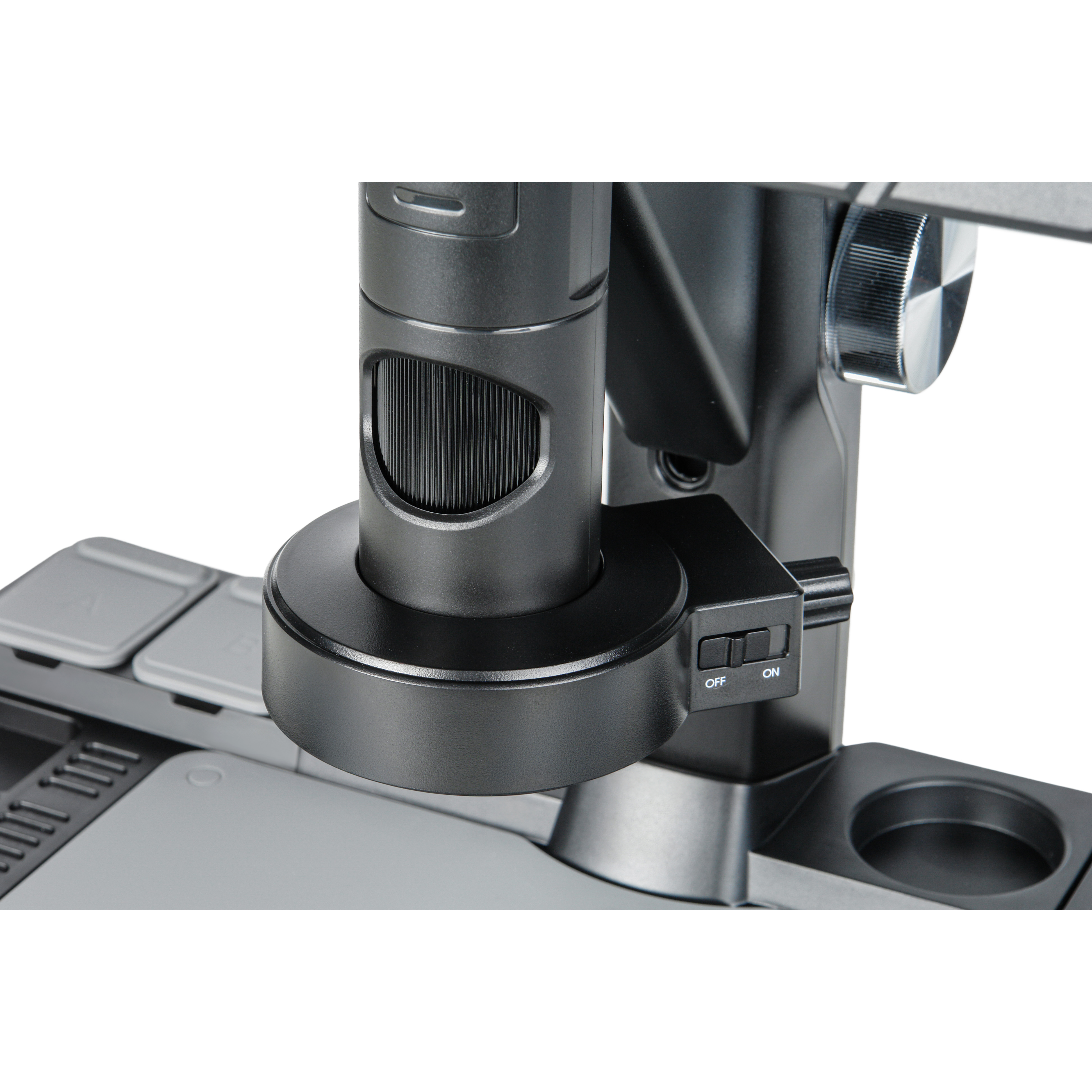 Микроскоп МИКМЕД LCD 10-12Mp установлен на традиционном штативе со составным основанием. Основание имеет увеличенный размер 255 х 380 мм и служит предметным столиком. Благодаря большому количеству отсеков и контейнеров для необходимых в работе мелких деталей основание выполняет функцию органайзера. В комплект входит противоскользящий силиконовый коврик. Нейтрально серая матовая поверхность коврика способствует точной автоматической настройки WB.