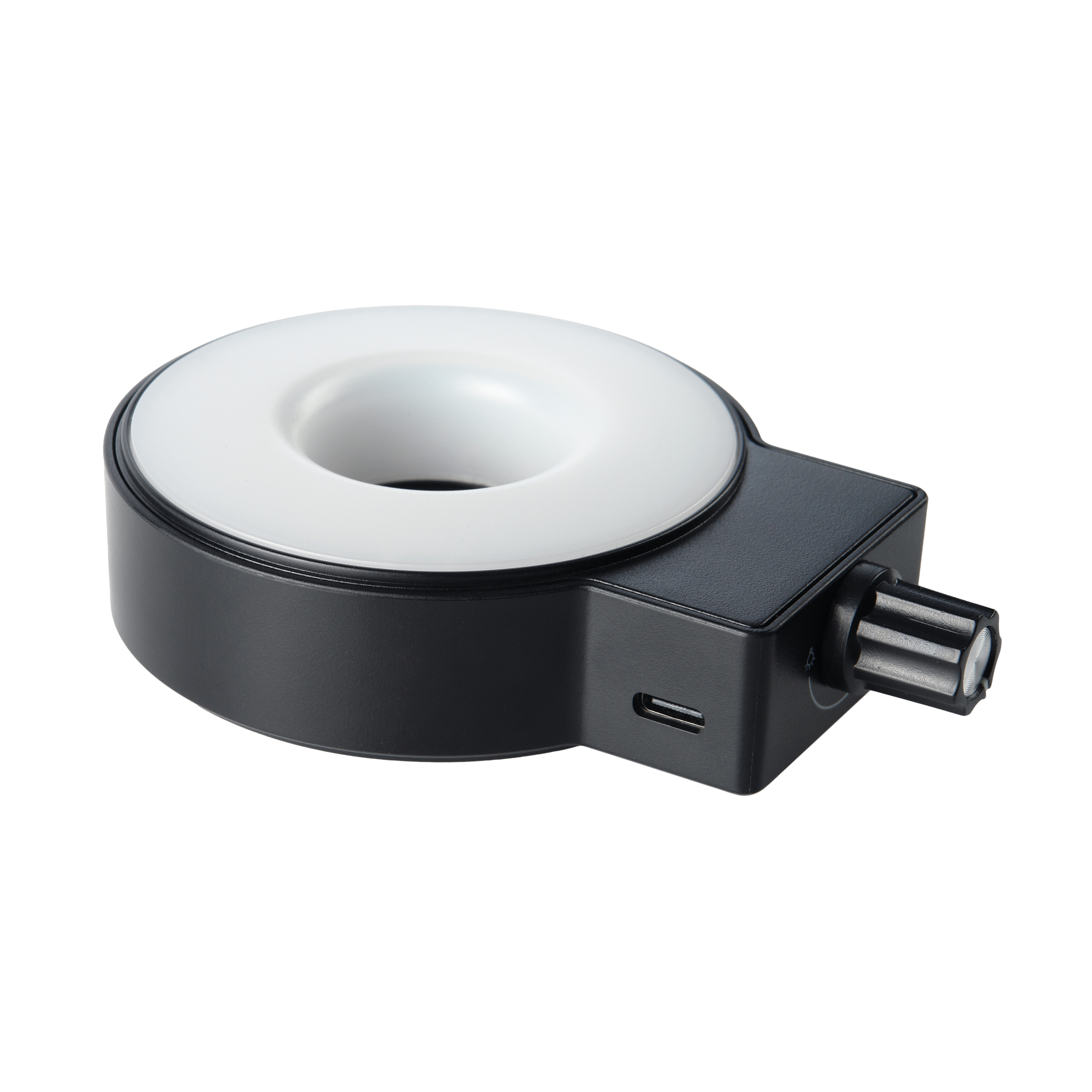 В осветителе используется 30 светодиодов белого света со спектром излучения близким к дневному свету. Подобный свет способствует правильной цветопередаче и точной автоматической настройке WB. Светодиоды расположены по кольцу вокруг объектива и благодаря такой конфигурации достигается равномерное освещение объекта без ассиметричных косых теней препятствующих проведению точных измерений размеров объекта и получению ложных результатов исследований. Осветитель имеет бесступенчатую регулировку яркости, она производится рукояткой на корпусе осветителя. Питание светодиодов, также, как камеры и монитора, осуществляется от встроенного аккумулятора. Осветитель оснащен защитным рассеивающим стеклом, повышающим равномерность освещения.