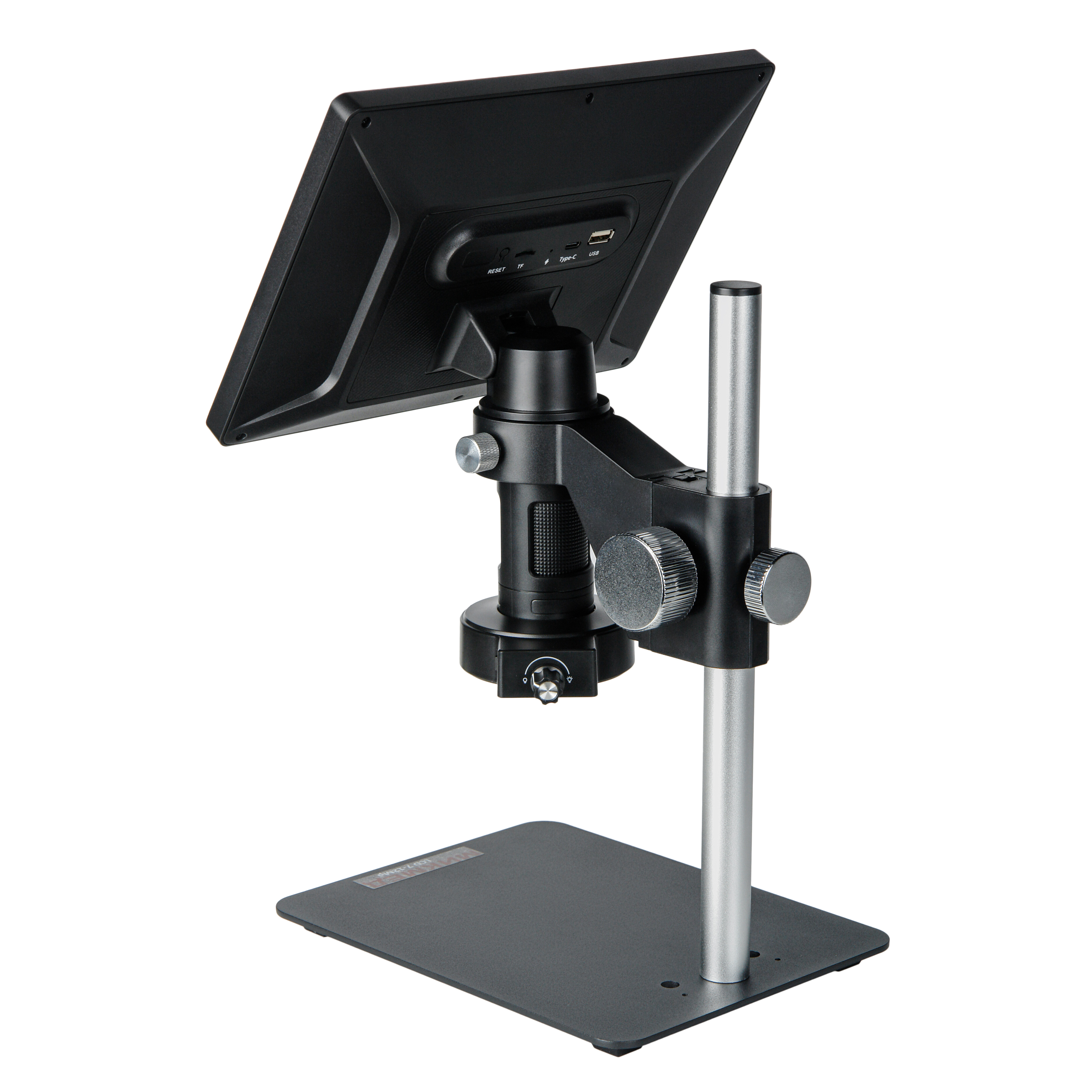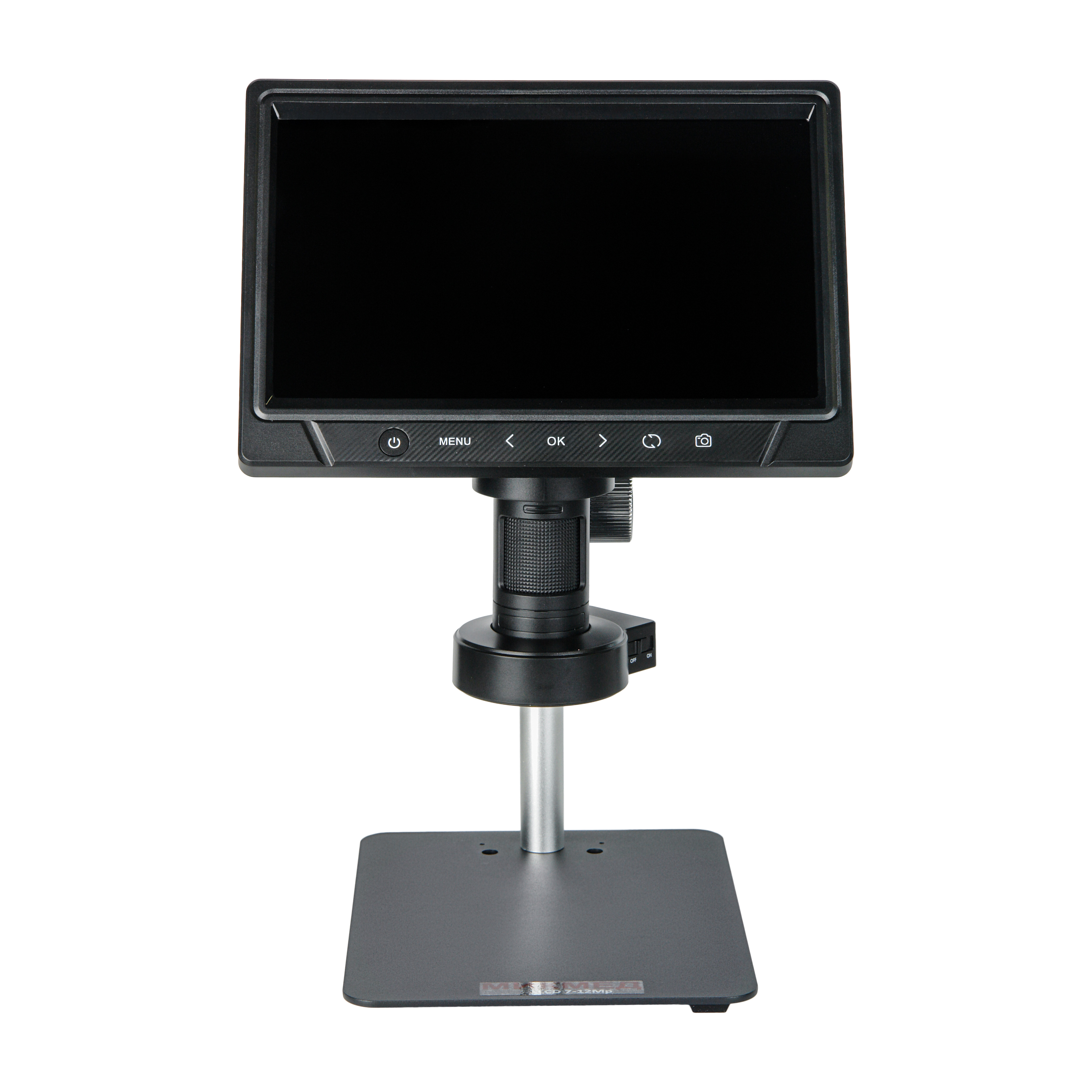 В микроскопе использован монитор формата 16:9 с диагональю 7 дюймов на IPS матрице с разрешением 1024х600 точек. Применение жидкокристаллической матрицы c технологией IPS позволяет наблюдать отчетливое изображение с углами обзора до 170 град. без затемнения, что позволяет участвовать в исследованиях нескольким лицам и проводить наблюдения с комфортом и без чрезмерного напряжения зрения. Монитор обеспечивает высокую яркость, контрастность и точное воспроизведение цветов изображения. На корпусе монитора расположены кнопки всех основных настроек, слот для карты памяти и интерфейсы USB2.0 и USB Type С.