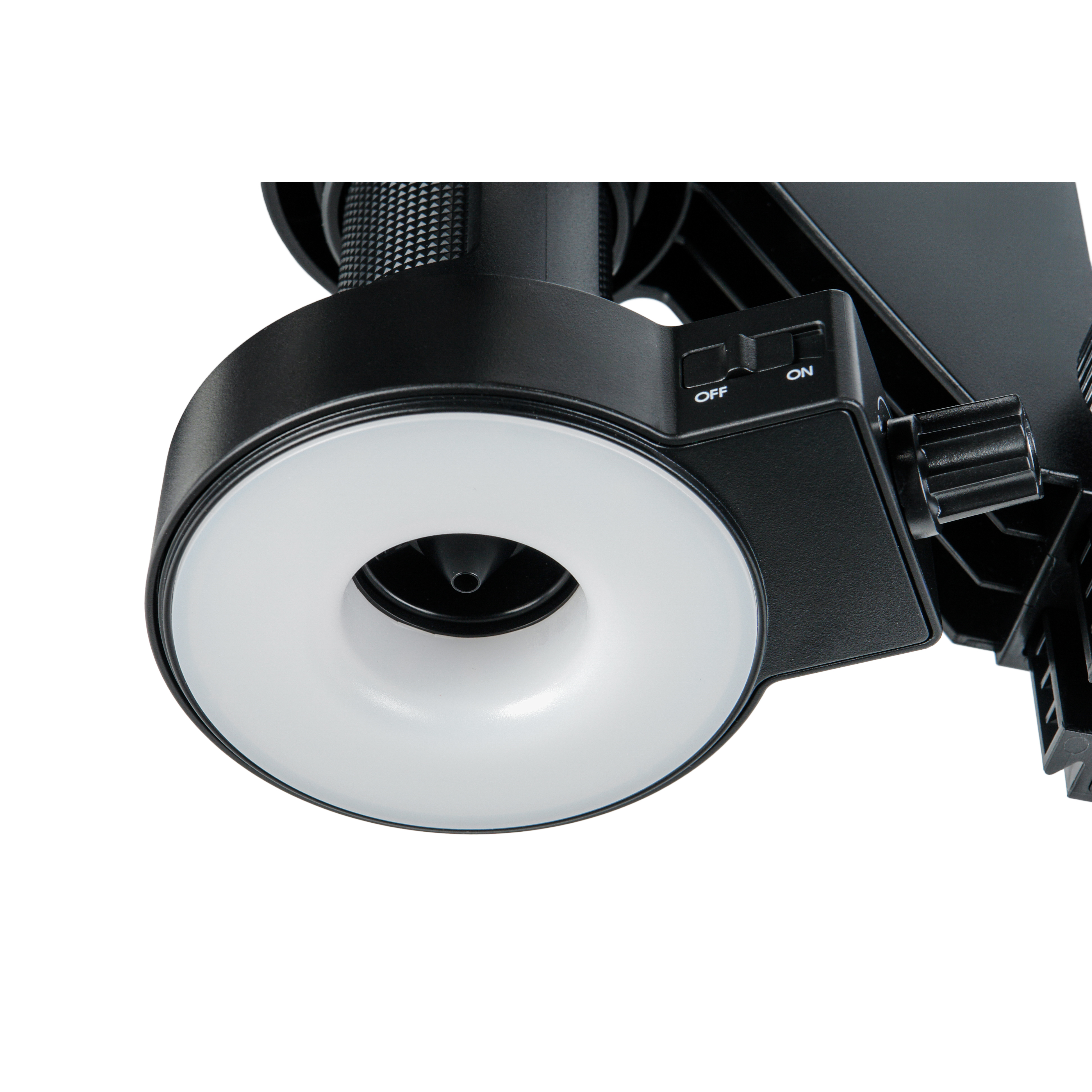 В осветителе используется 30 светодиодов белого света со спектром излучения близким к дневному свету. Подобный свет способствует правильной цветопередаче и точной автоматической настройке WB. Светодиоды расположены по кольцу вокруг объектива и благодаря такой конфигурации достигается равномерное освещение объекта без ассиметричных косых теней, препятствующих проведению точных измерений размеров объекта и получению ложных результатов исследований. Осветитель имеет бесступенчатую регулировку яркости, она производится рукояткой на корпусе осветителя. Питание светодиодов, также, как камеры и монитора, осуществляется от встроенного аккумулятора. Осветитель оснащен защитным рассеивающим стеклом, повышающим равномерность освещения.