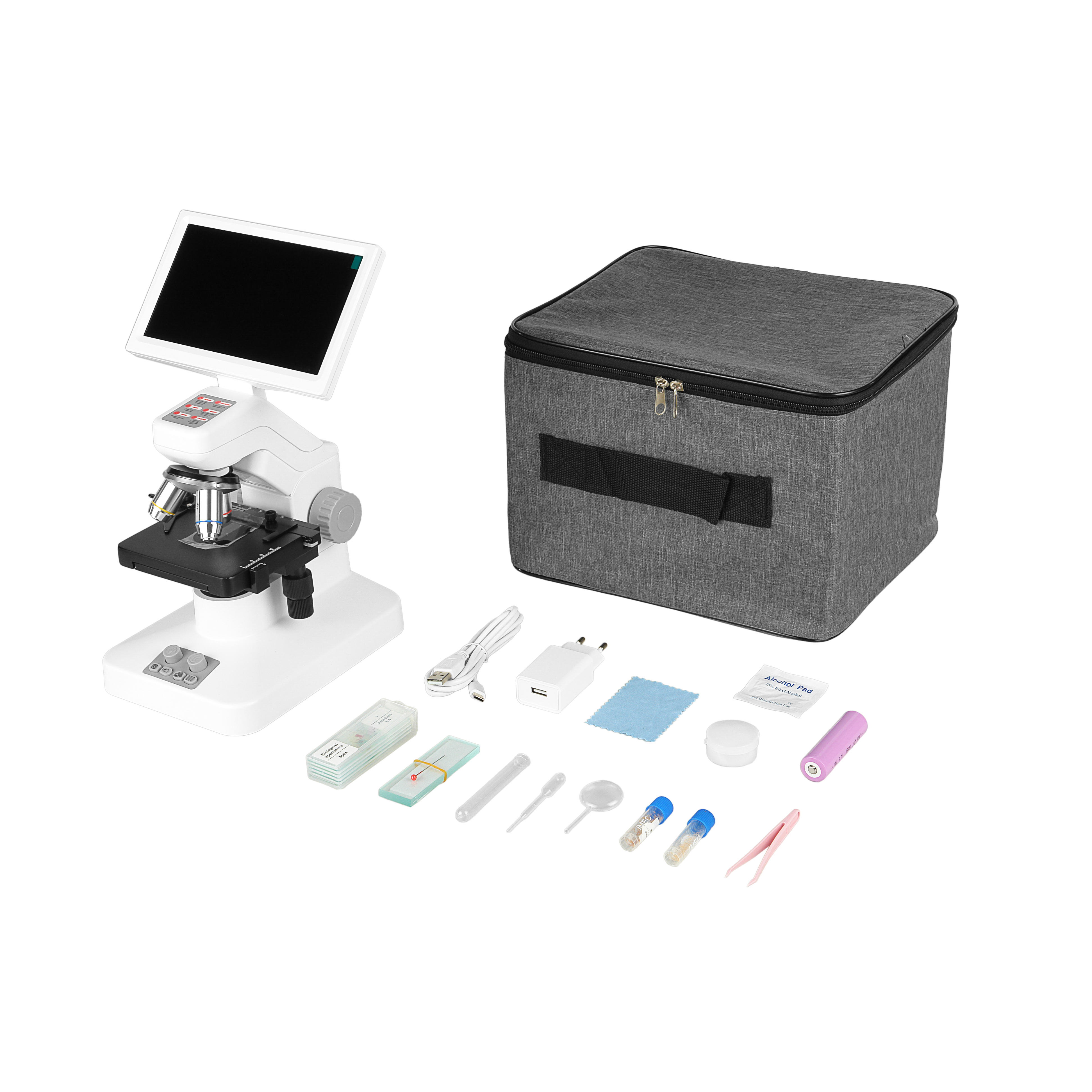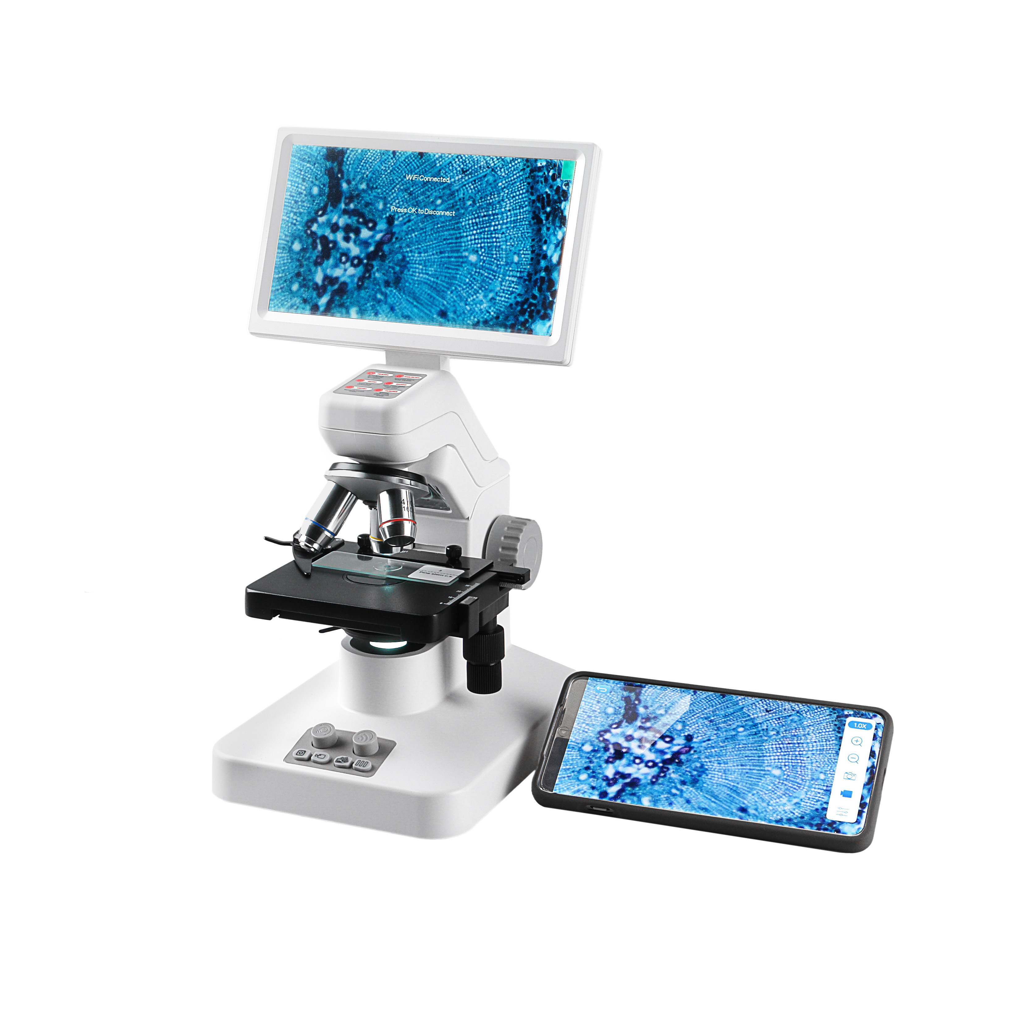 Встроенная 3Мр камеры и IPS монитора 7” позволяют в режиме реального времени и без чрезмерного напряжения глаз наблюдать изображение на мониторе микроскопа без подключения к ПК. Жидкокристаллическая матрица c технологией IPS позволяет наблюдать отчетливое изображение с углами обзора до 170⁰ без затемнения, это позволяет проводить с комфортом групповые занятия.