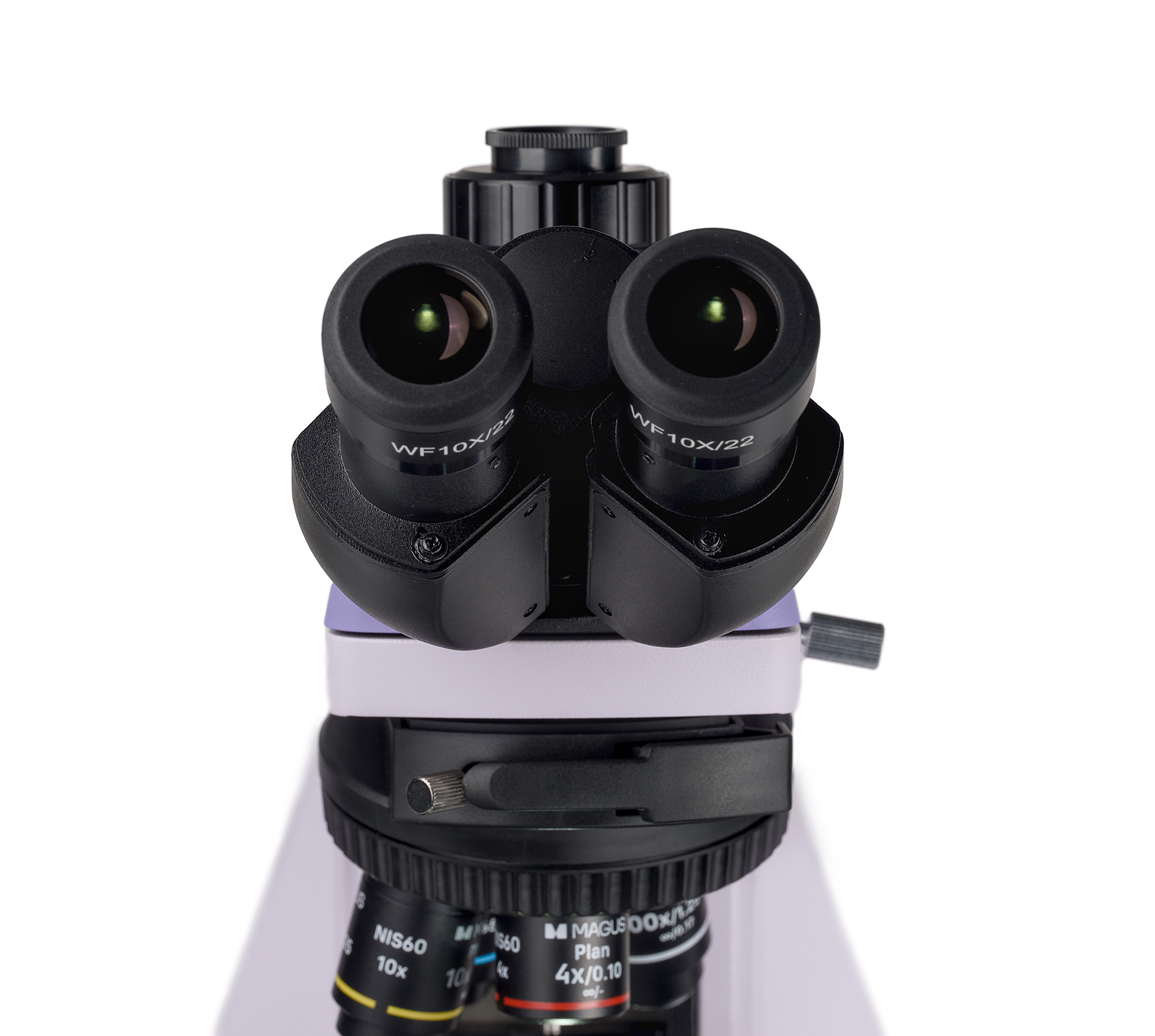 Микроскоп имеет тринокулярную зрительную насадку с «бесконечными» окулярными тубусами. Высота выходного зрачка регулируется. Его положение на вред поворотом тубусов на 360°. Цифровая камера встроена в канал визуализации. Свет перемещается на камеру и окуляры в пропорциях 50/50. В набор микроскопа включены базовые окуляры 10х/22 мм с механизмом настройки диоптрий – настройка на тубусах не производилась. Пользователям в очках пригодятся комплектные резиновые наглазники, которые защищают стекла от потертостей и царапин.