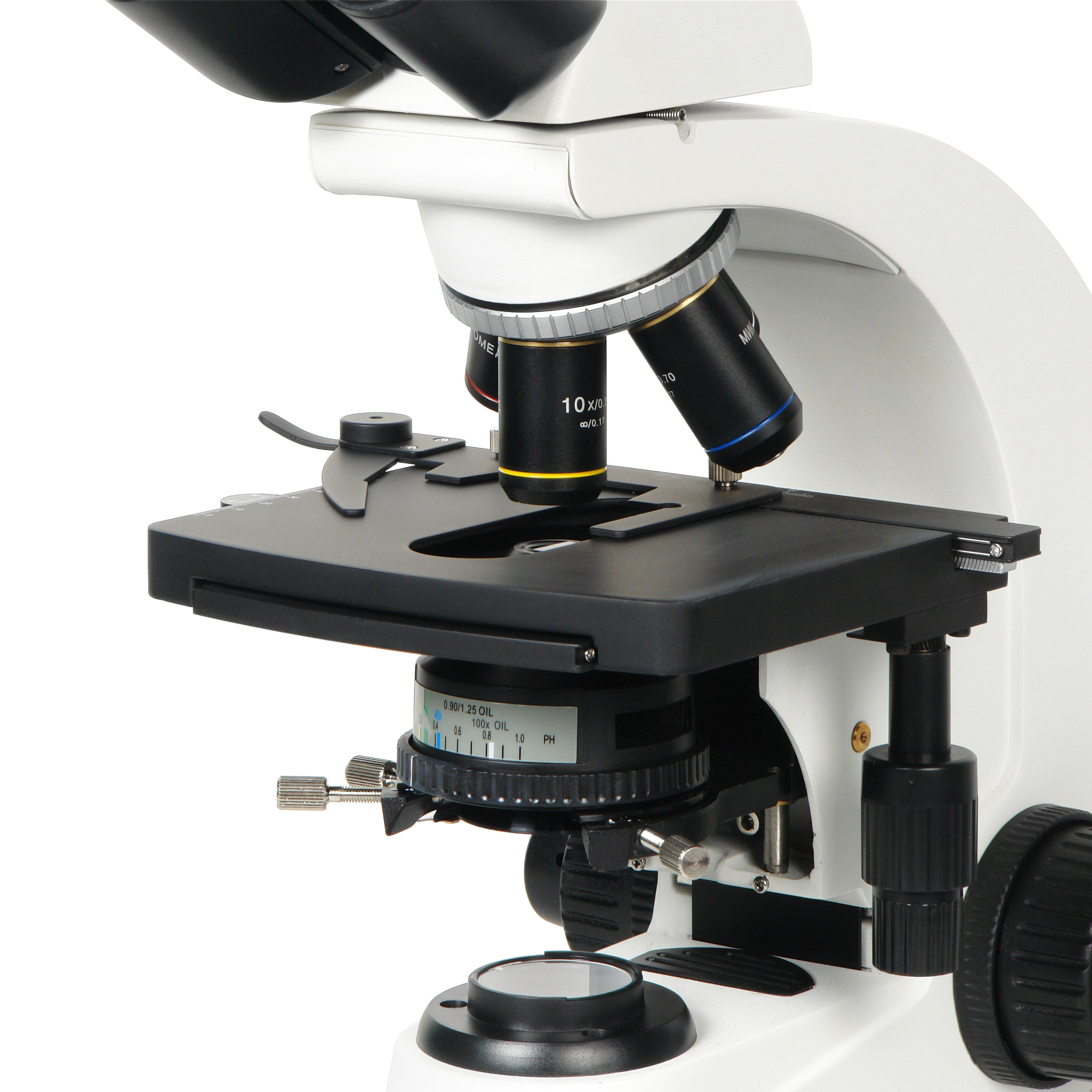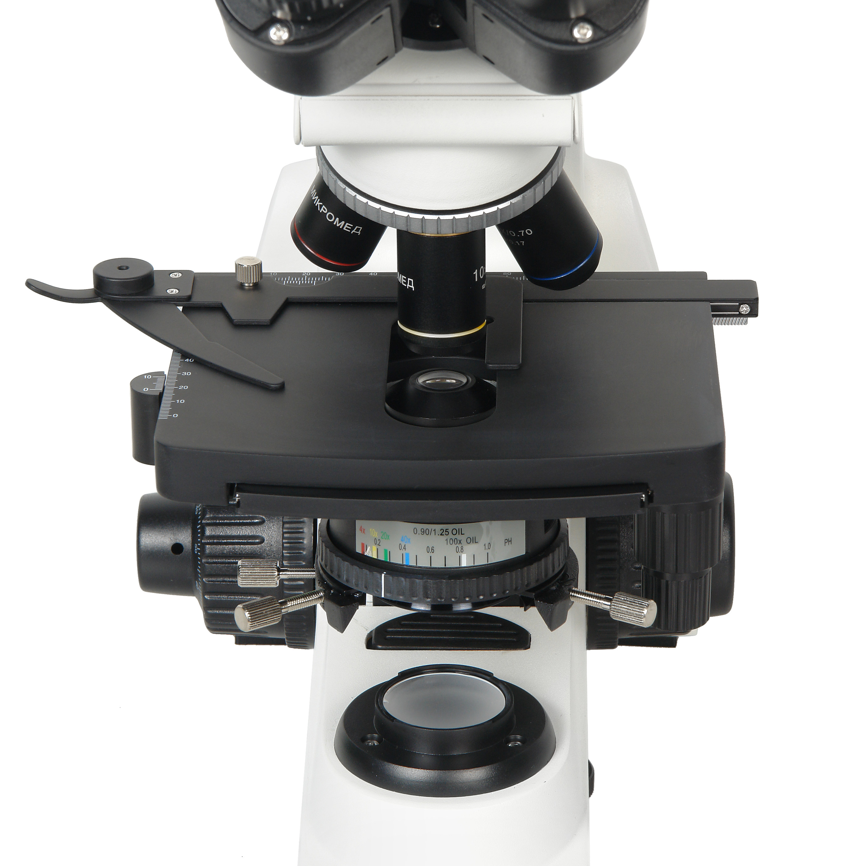 с иммерсионным конденсором Аббе 0.90/1.25oil. Числовая апертура конденсора при работе с масляной иммерсией А=1.25, при сухом использовании А=0.9. Конденсор имеет центрируемую оправу и регулируемую апертурную ирисовую диафрагму. Диапазон перемещения конденсора по высоте составляет 19 мм. Апертурная диафрагма конденсора снабжена шкалой с цветной маркировкой увеличений и апертур используемых объективов. В оправе конденсора предусмотрен слот для установки дополнительного устройства - слайдера с диафрагмой темного поля.