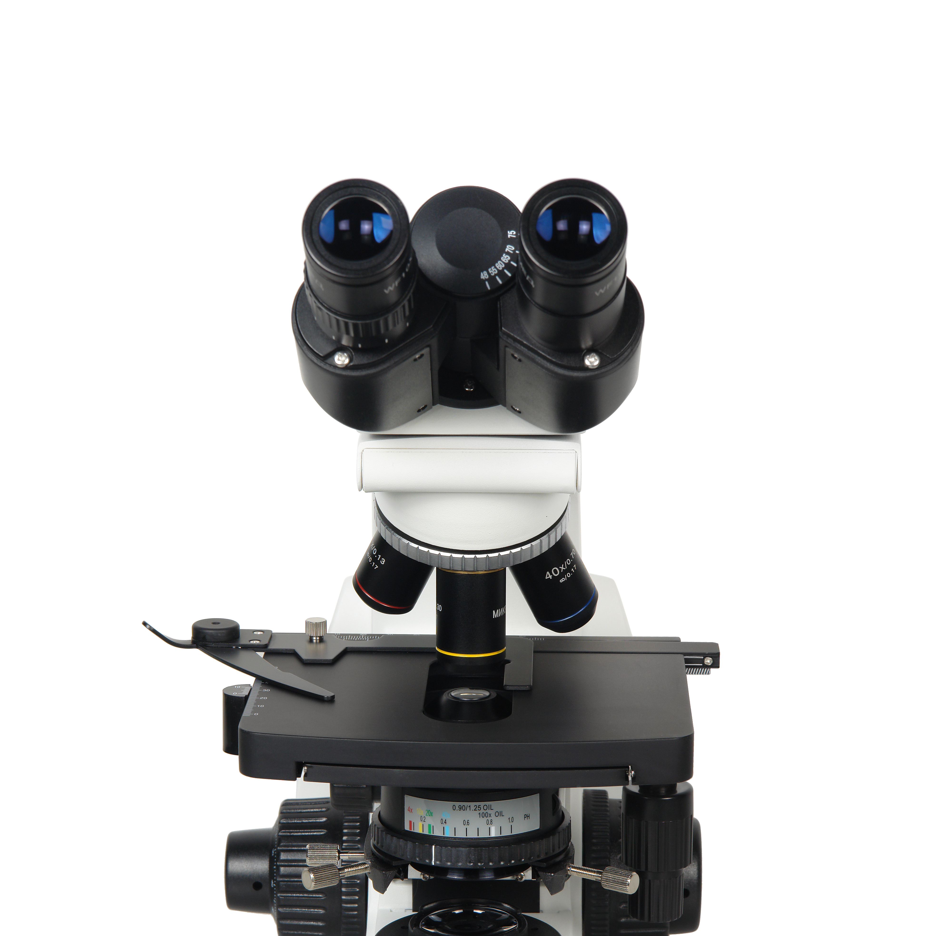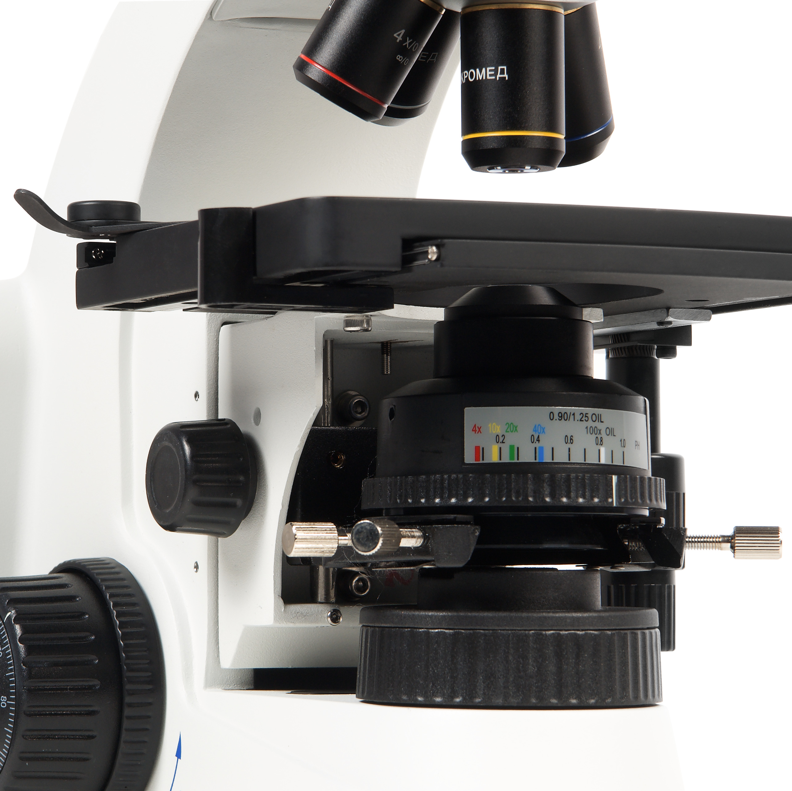Высокое оптическое качество объективов обеспечивает информативность и комфорт при исследованиях и отличное качество записываемых изображений. Все объективы парфокальны, поэтому при смене увеличений не теряется наводка на резкость. Объективы микроскопа установлены на револьверном устройстве, рассчитанном на 4 объектива, что позволяет наблюдателю быстро переходить к исследованиям с различными увеличениями. Бинокулярная визуальная насадка имеет поворотную конструкцию, что позволяет проводить исследования комфортно и без чрезмерного напряжения.