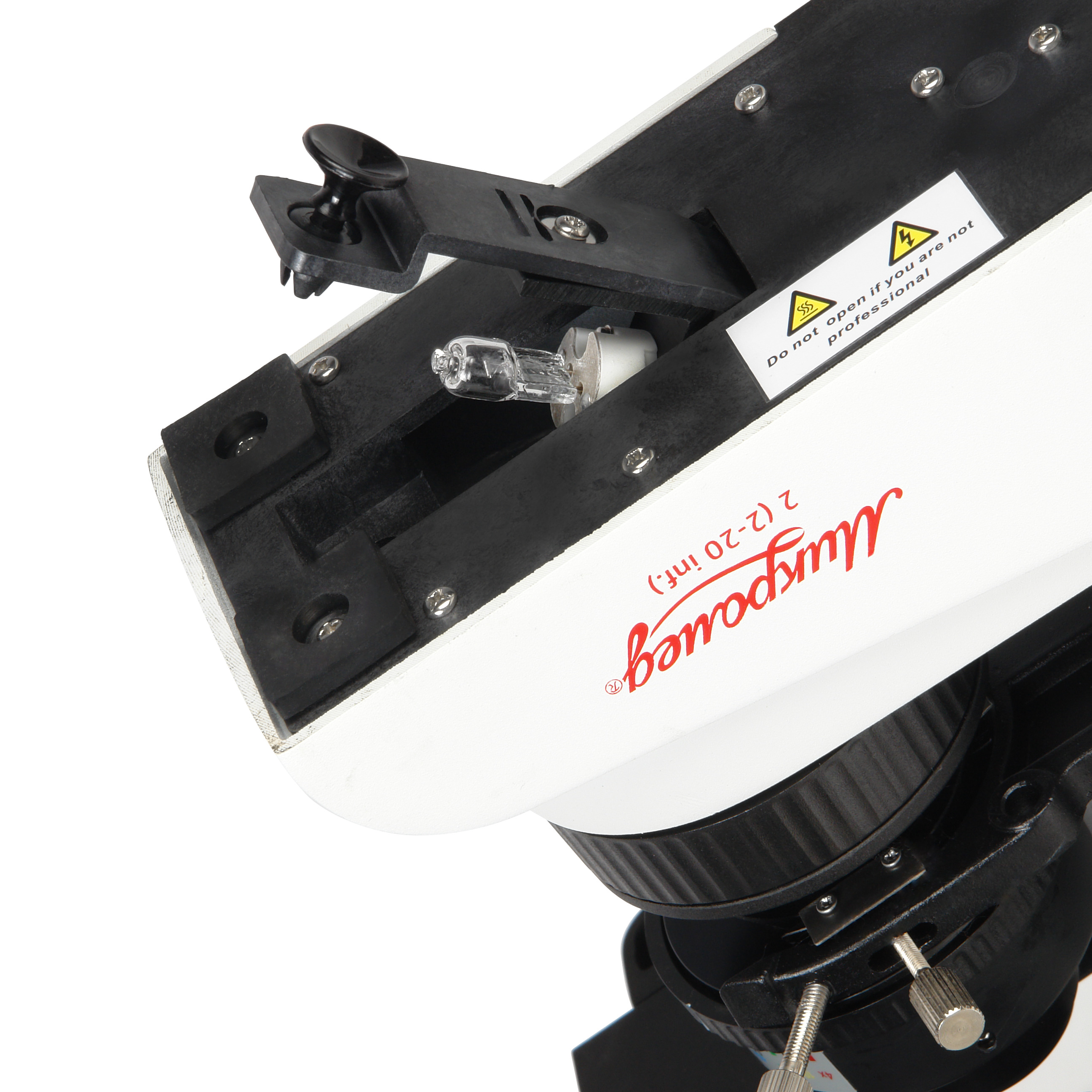 Осветительная система микроскопа состоит из коллектора с полевой диафрагмой, конденсора Аббе и галогенной лампы с регулируемой яркостью. Блок питания осветителя встроен в основание микроскопа. Микроскоп оснащен иммерсионным конденсором Аббе 0.90/1.25oil. При работе с масляной иммерсией его числовая апертура А=1.25. Конденсор центрируемый, имеет апертурную диафрагму и слот для установки дополнительного слайдера с устройством темного поля. Для удобства настройки освещения апертурная диафрагма имеет шкалу с цветной маркировкой значений апертур и увеличений используемых объективов. Диапазон перемещения конденсора по высоте составляет 19 мм.