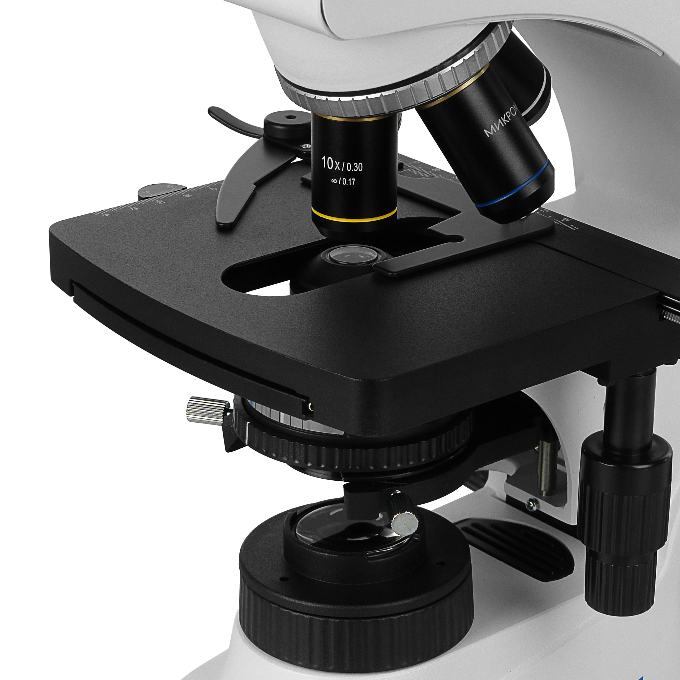 Механический предметный столик микроскопа Микромед 2 (2LED inf) имеет размер 156 х 138 мм и позволяет перемещать исследуемый образец с помощью коаксиальных рукояток в диапазоне