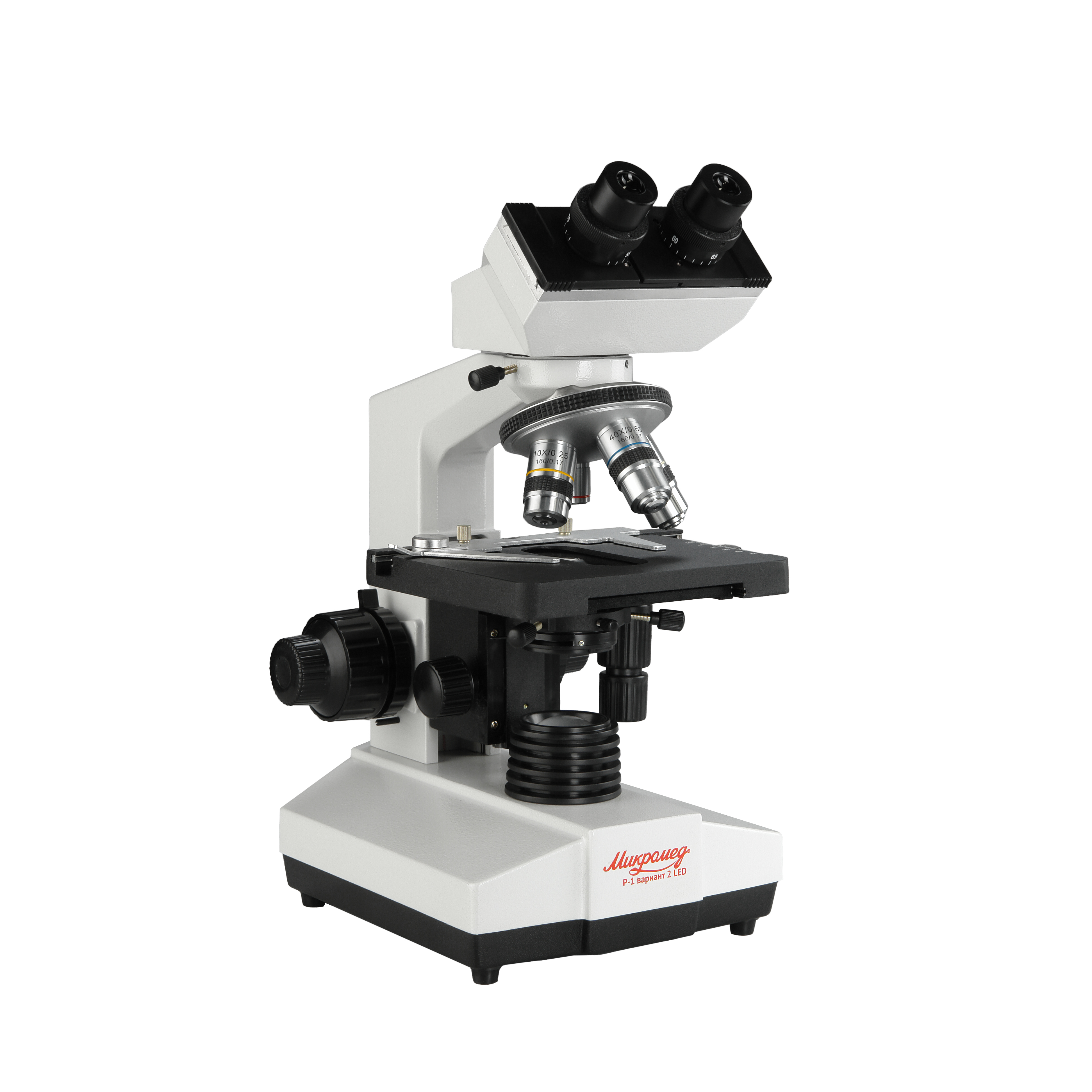 Микроскоп Микромед Р-1 вариант 2 LED спроектирован на оптическую длину тубуса 160 мм. Оптическая система микроскопа включает в себя бинокулярную визуальную насадку, объективы на револьверном устройстве, коллектор и конденсор осветительного устройства с держателем светофильтров.