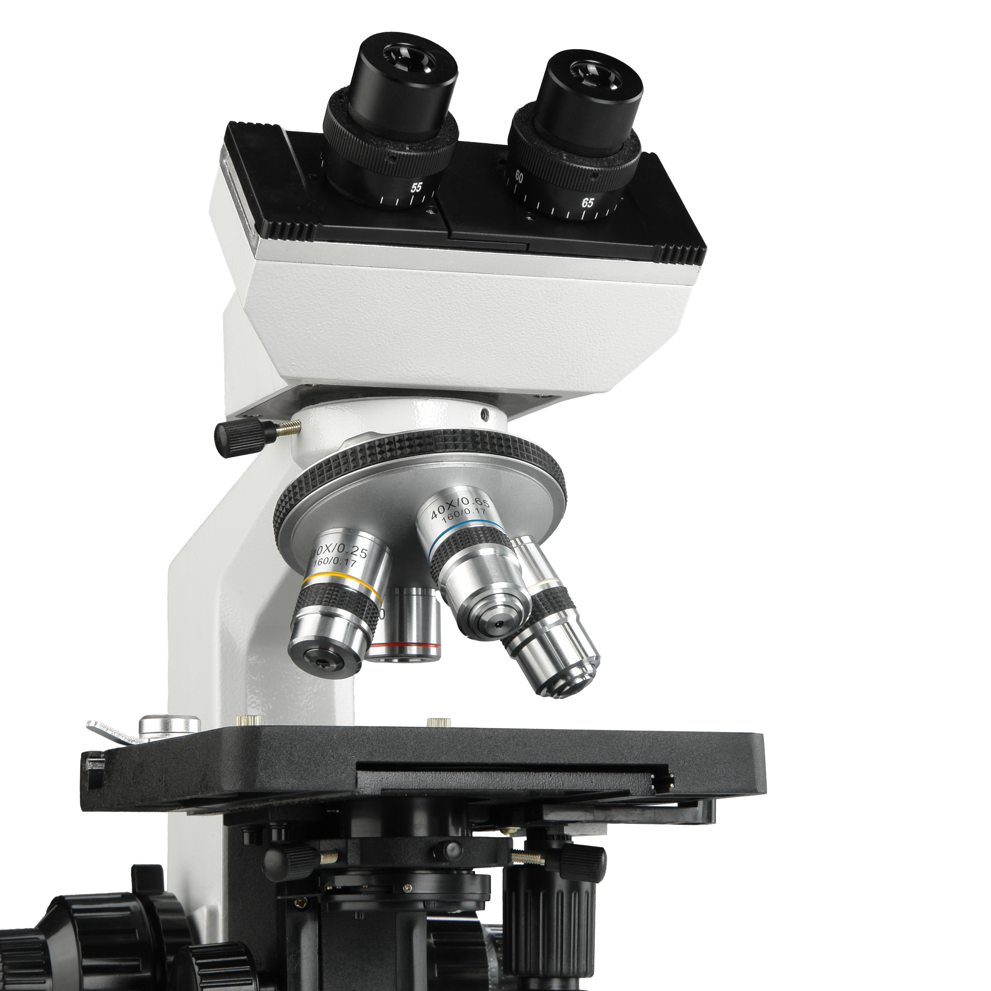 Двухкоординатный механический предметный столик микроскопа имеет увеличенный размер 140х155 мм. Столик позволяет перемещать препарат по координатам X и Y в пределах 80 мм x 50 мм. Для плавного и точного перемещения применены две передачи на демпфированных зубчатых рейках. Движение по координатам X и Y осуществляется коаксиальными рукоятками с правой стороны столика. Для точного позиционирования препарата столик снабжен шкалами и нониусами с ценой деления 1 мм и 0,1 мм соответственно. В комплекте к столику идет накладной препаратодержатель с поворотным прижимом для предметного стекла.