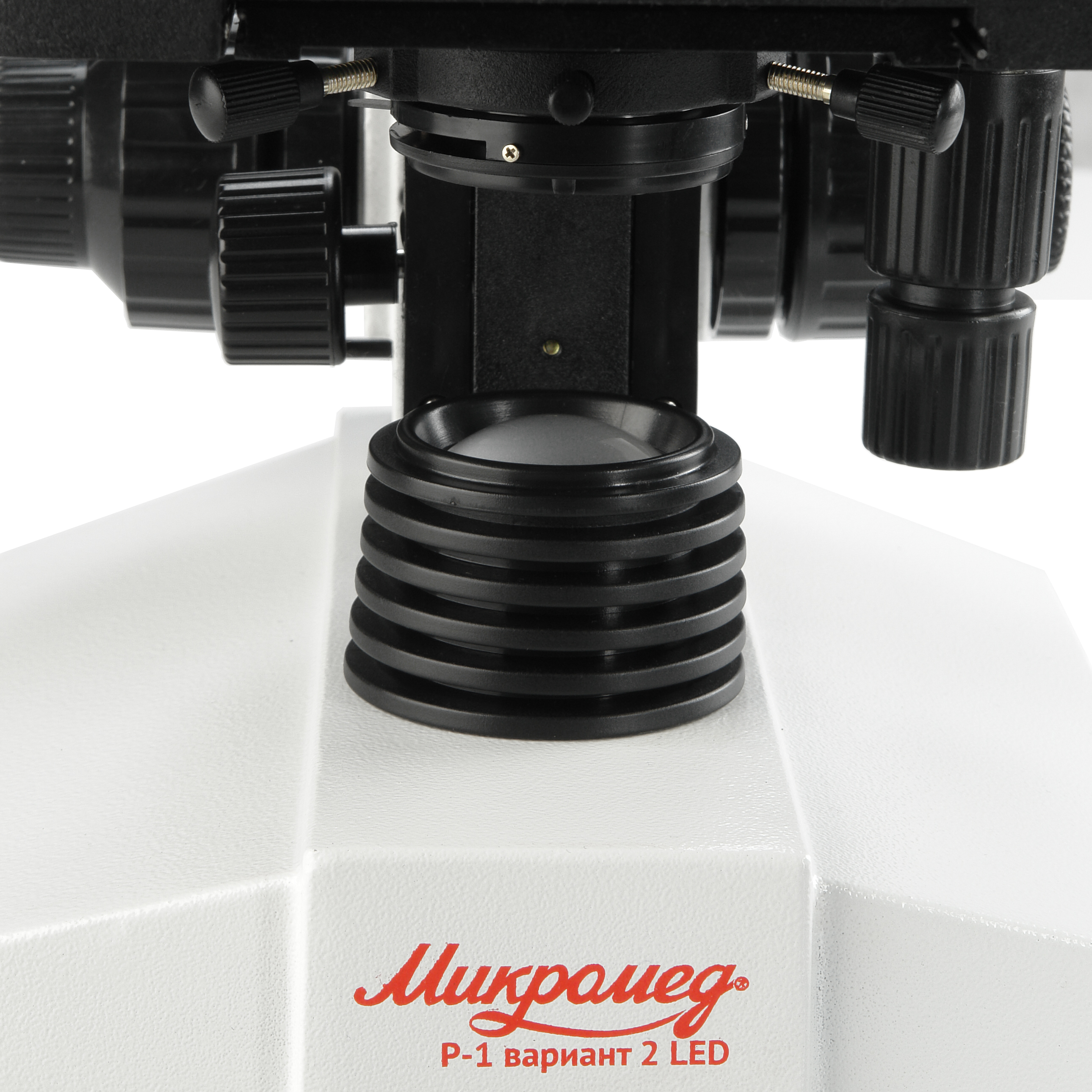 Микроскоп Микромед Р-1 вариант 2 LED оснащен осветительной системой проходящего света профессионального уровня. В ней использован конденсор Аббе с числовой апертурой А=1.25 установленный на кронштейне с центрировочными винтами. Конденсор снабжен регулируемой апертурной ирисовой диафрагмой. Диапазон перемещения конденсора по высоте составляет 20 мм. Конденсор имеет поворотный держатель для установки светофильтров Ø32 мм. Фронтальная линза конденсора имеет резьбовую оправу и при работе с объективами малых увеличений может быть выведена из хода лучей.
