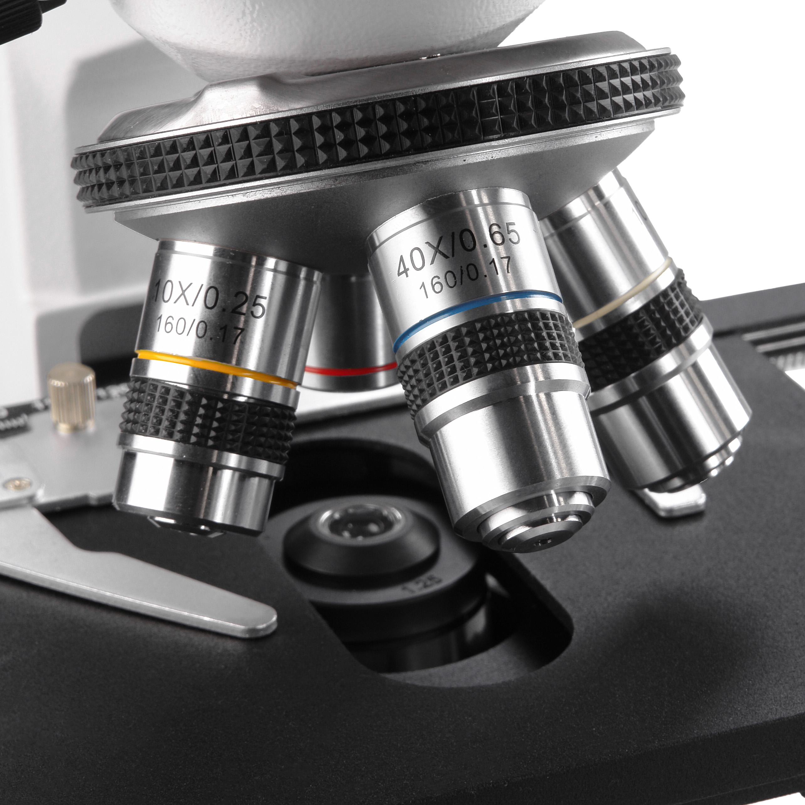В комплект микроскопа Микромед Р-1 вариант 2 LED входят объективы с ахроматической коррекцией для сухих исследований – 4x/0.1, 10x/0.25, 40x/0.65 и объектив для исследований с масляной иммерсией 100x/1.25 oil. Объективы 40x/0.65 и 100x/1.25 oil имеют оправы с подпружиненным оптическим блоком, что препятствует повреждению оптики и изучаемого образца. Все объективы имеют стандартную парфокальную высоту 45 мм и при смене увеличений объект исследования никогда не будет потерян.