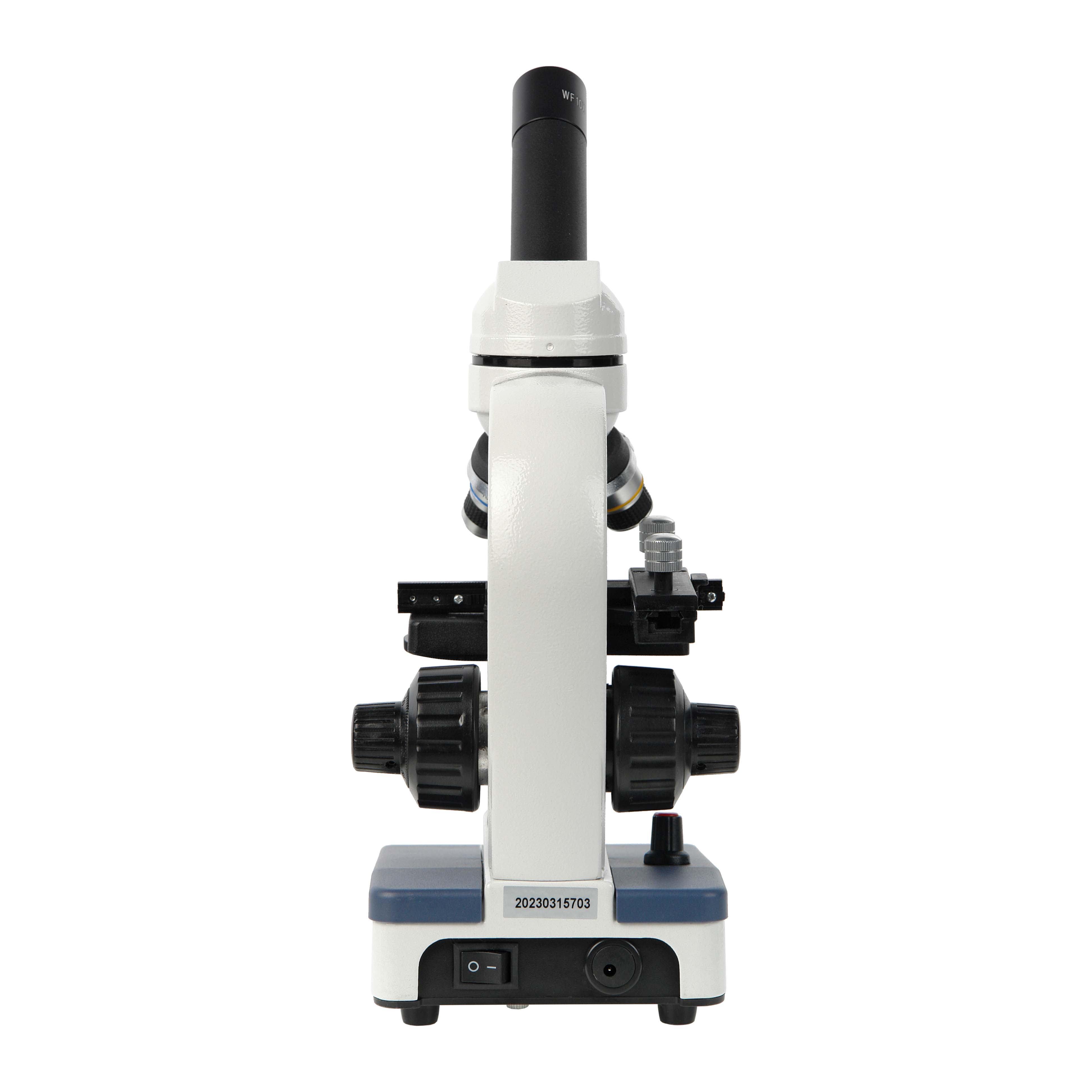 Осветитель снабжен коллекторной линзой, что повышает равномерность и яркость освещения предмета исследования и имеет бесступенчатую регулировку яркости. Питание микроскопа производится от 3-х щелочных батареек тип АА или от входящего в комплект сетевого адаптера.