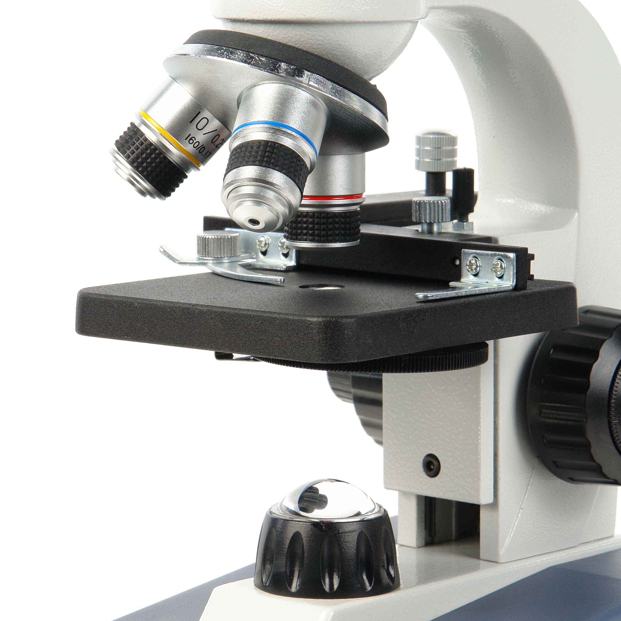 Все объективы парфокальны, поэтому при смене увеличений наводка на резкость не теряется. Объективы микроскопа установлены на револьверном устройстве, рассчитанном на 3 объектива, что позволяет наблюдателю быстро переходить к исследованиям с различными увеличениями.