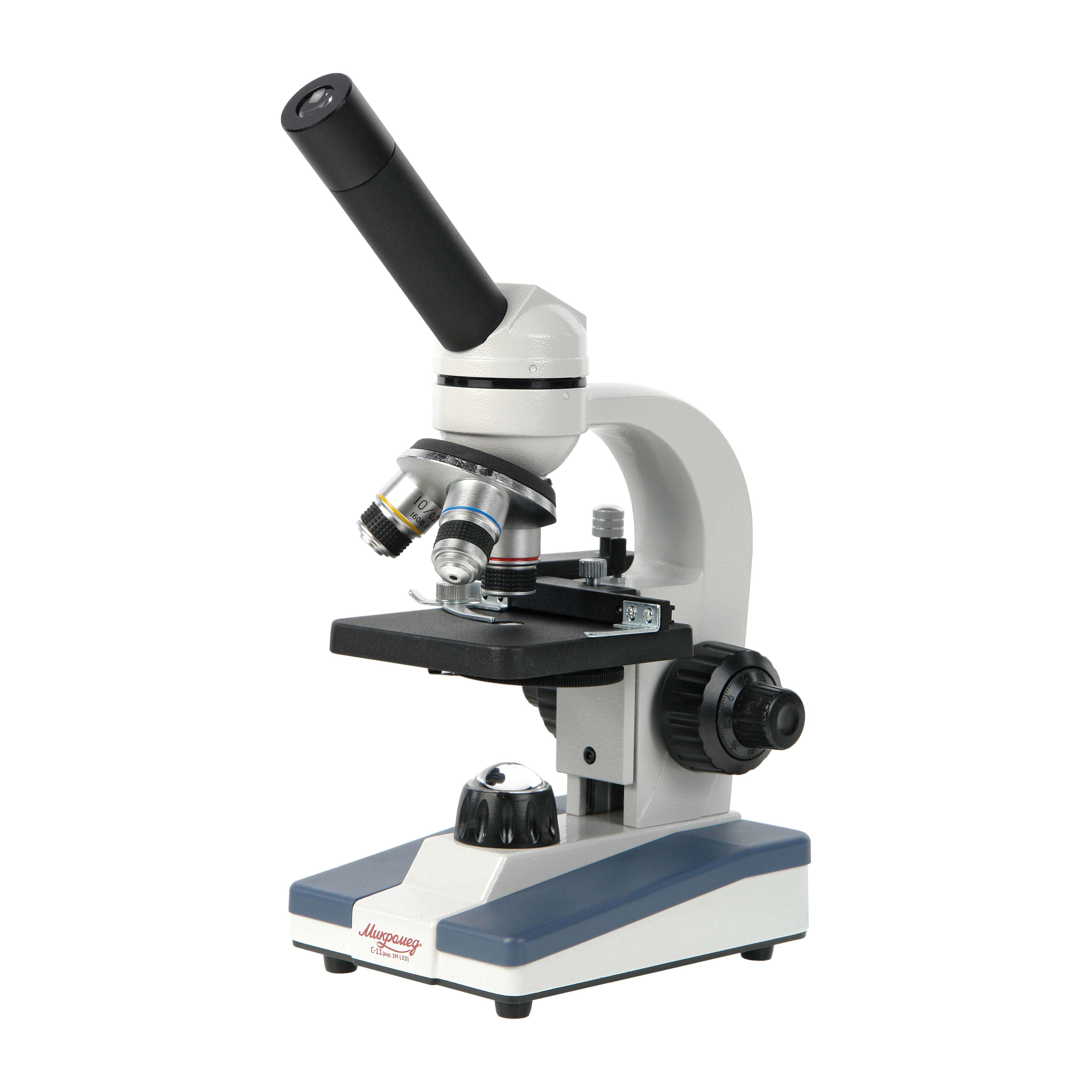 - Штатив микроскопа Микромед С-11(вар. 1М LED) с визуальный насадкой, наклонным окулярным тубусом, механизмом фокусировки, встроенным осветителем проходящего света с регулировкой яркости, блоком питания и револьверным устройством на 3 объектива – 1 шт