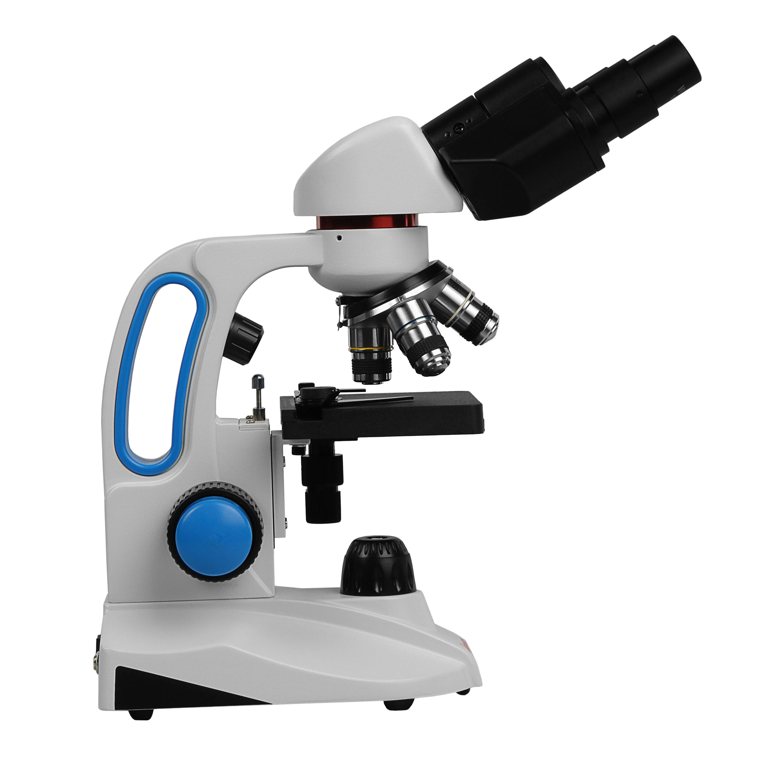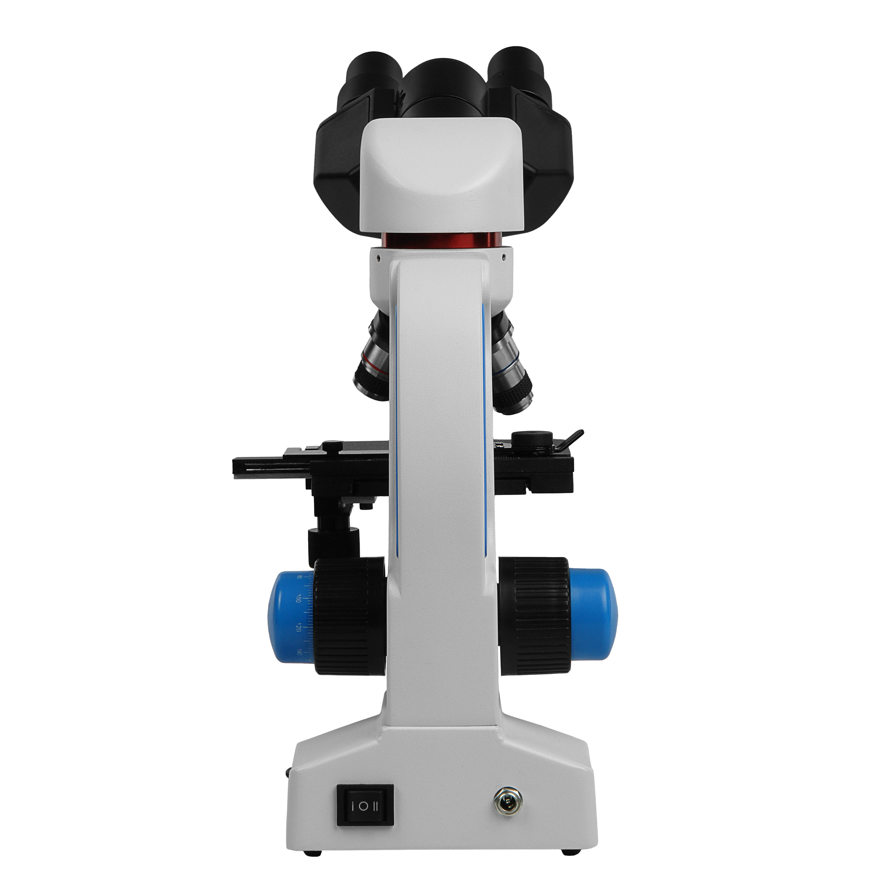 Револьверное устройство микроскопа рассчитано на установку четырех объективов. Смена объективов производится вращением револьверного устройства в любом направлении. Объективы парфокальны, и при смене увеличений важные детали объекта не потеряются, потребуется лишь немного подкорректировать фокусировку.