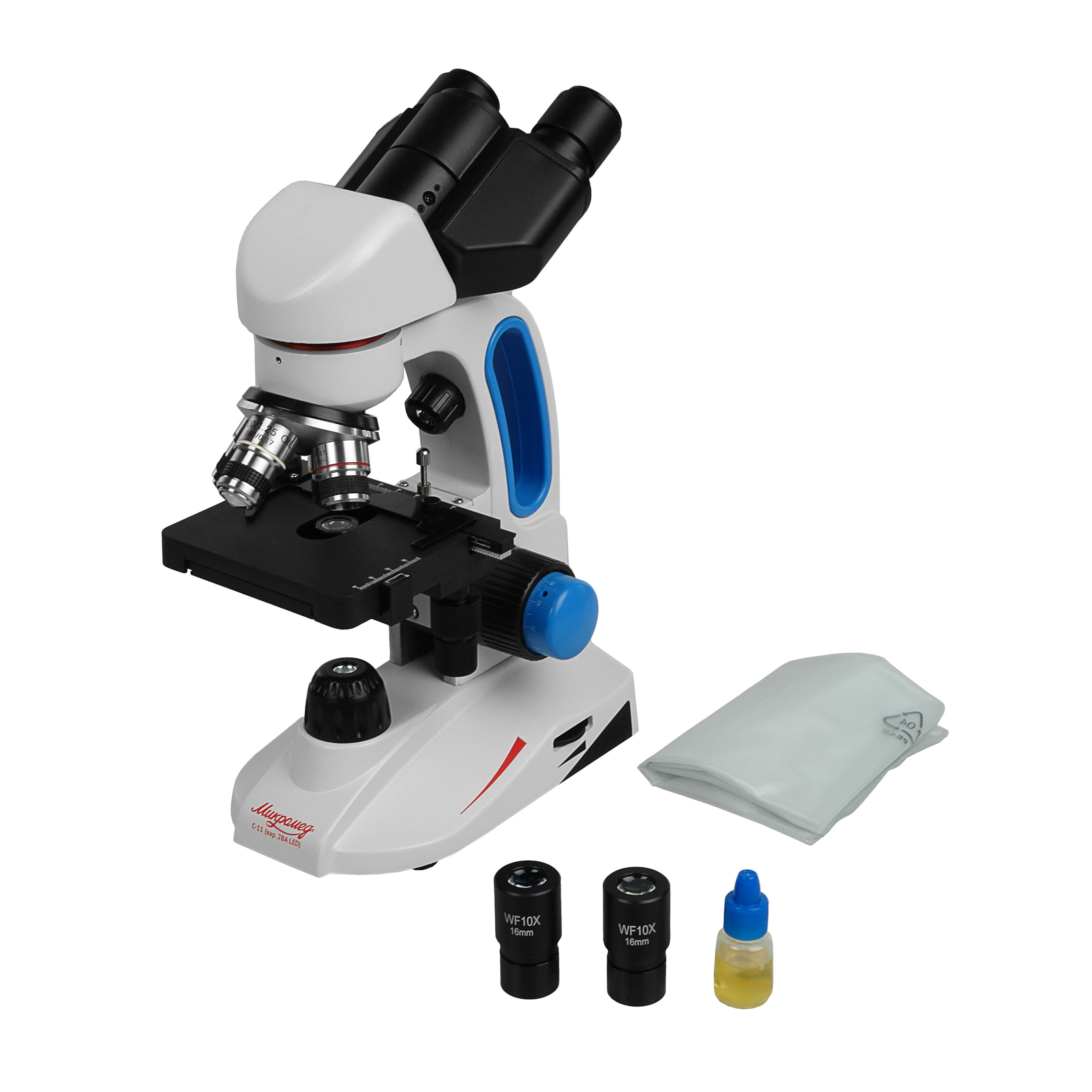 Комплектные окуляры широкого поля WF 10х/16 мм обеспечивают общее увеличение микроскопа от 40х до 1000х. Широко распространенный посадочный диаметр 23.2 мм позволяет использовать с микроскопом окуляры и с другими увеличениями.