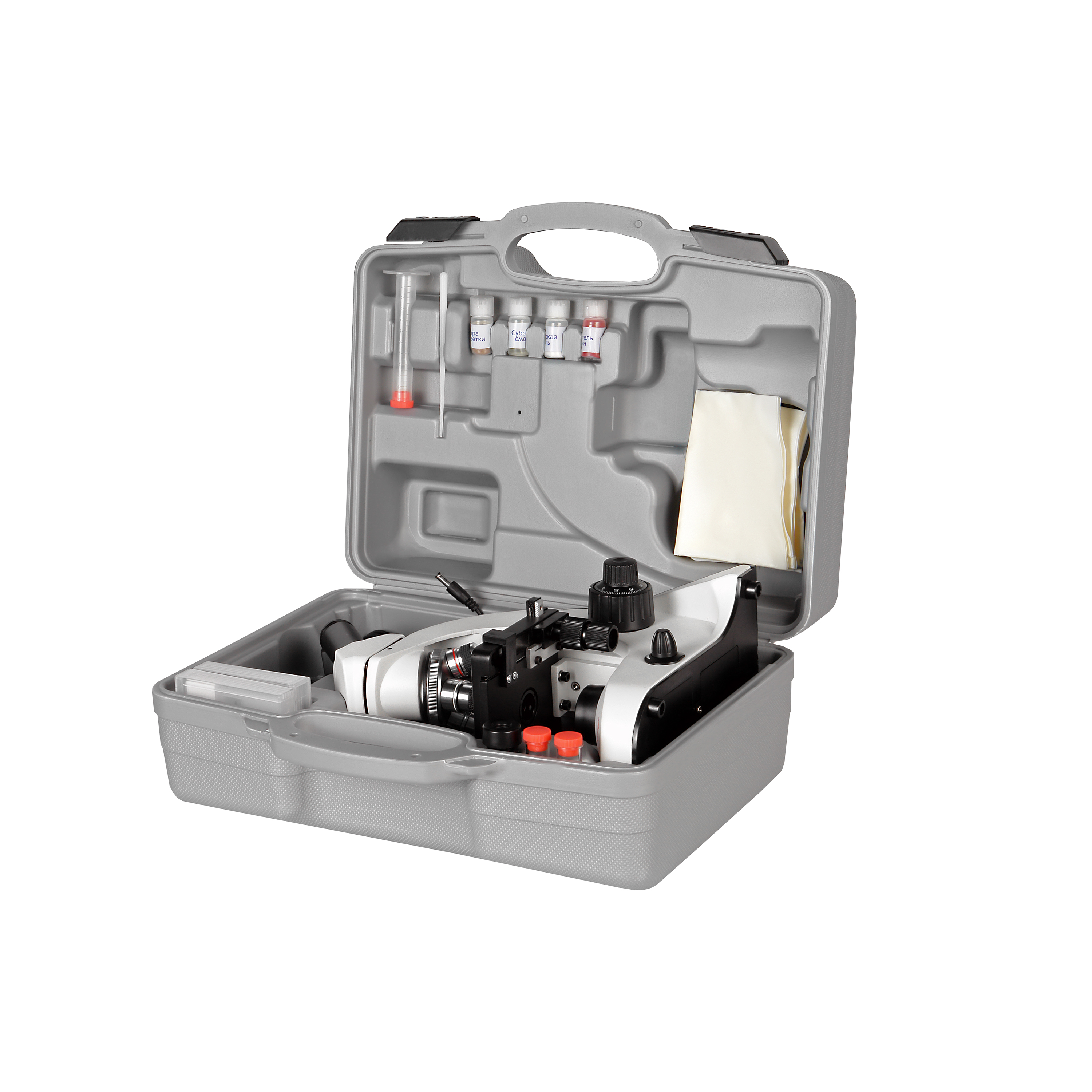 - Штатив со встроенным в основание LED осветителем проходящего света, LED осветителем отраженного света, револьверным устройством на 4 объектива и механизмом тонкой и грубой фокусировки